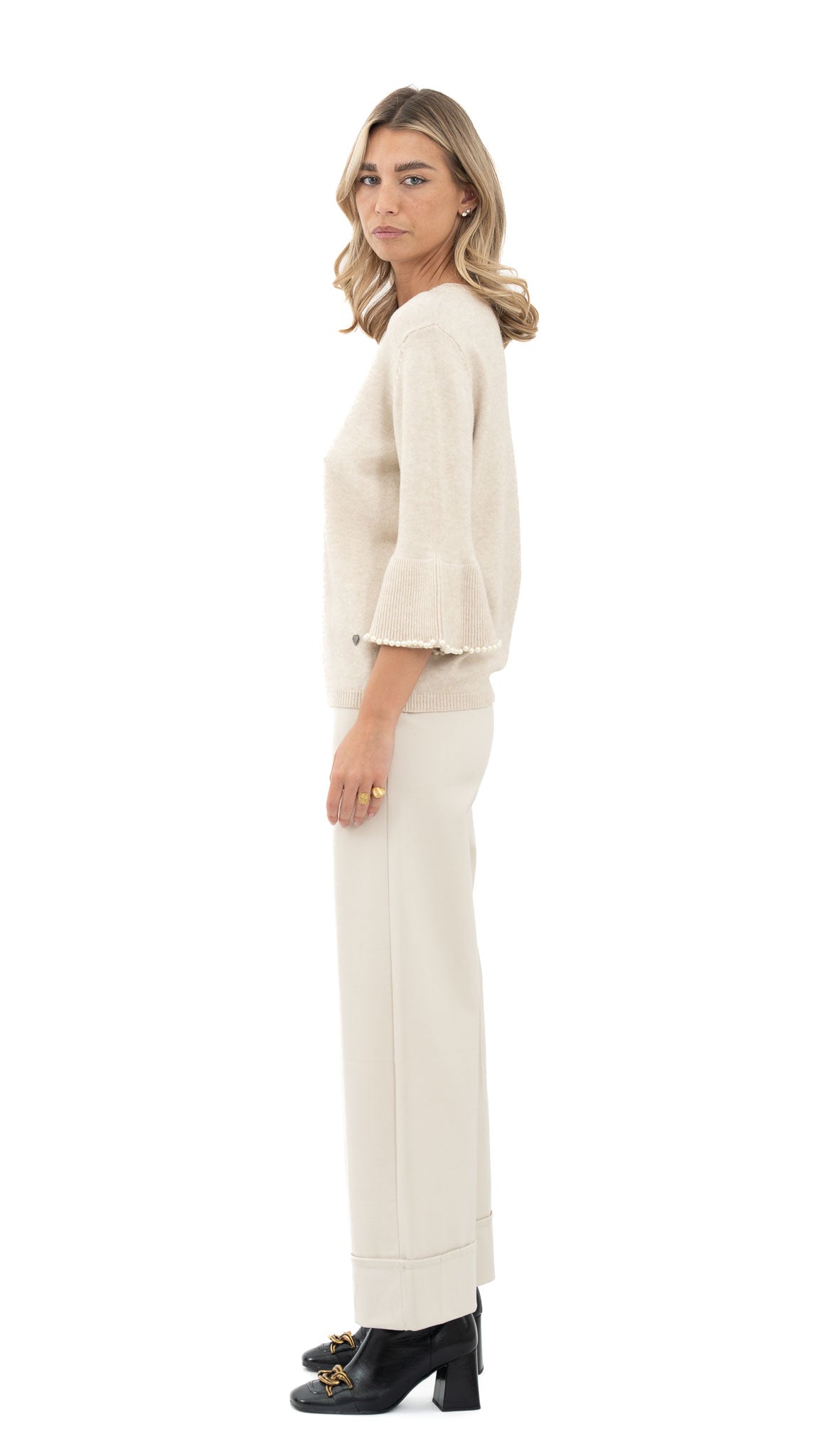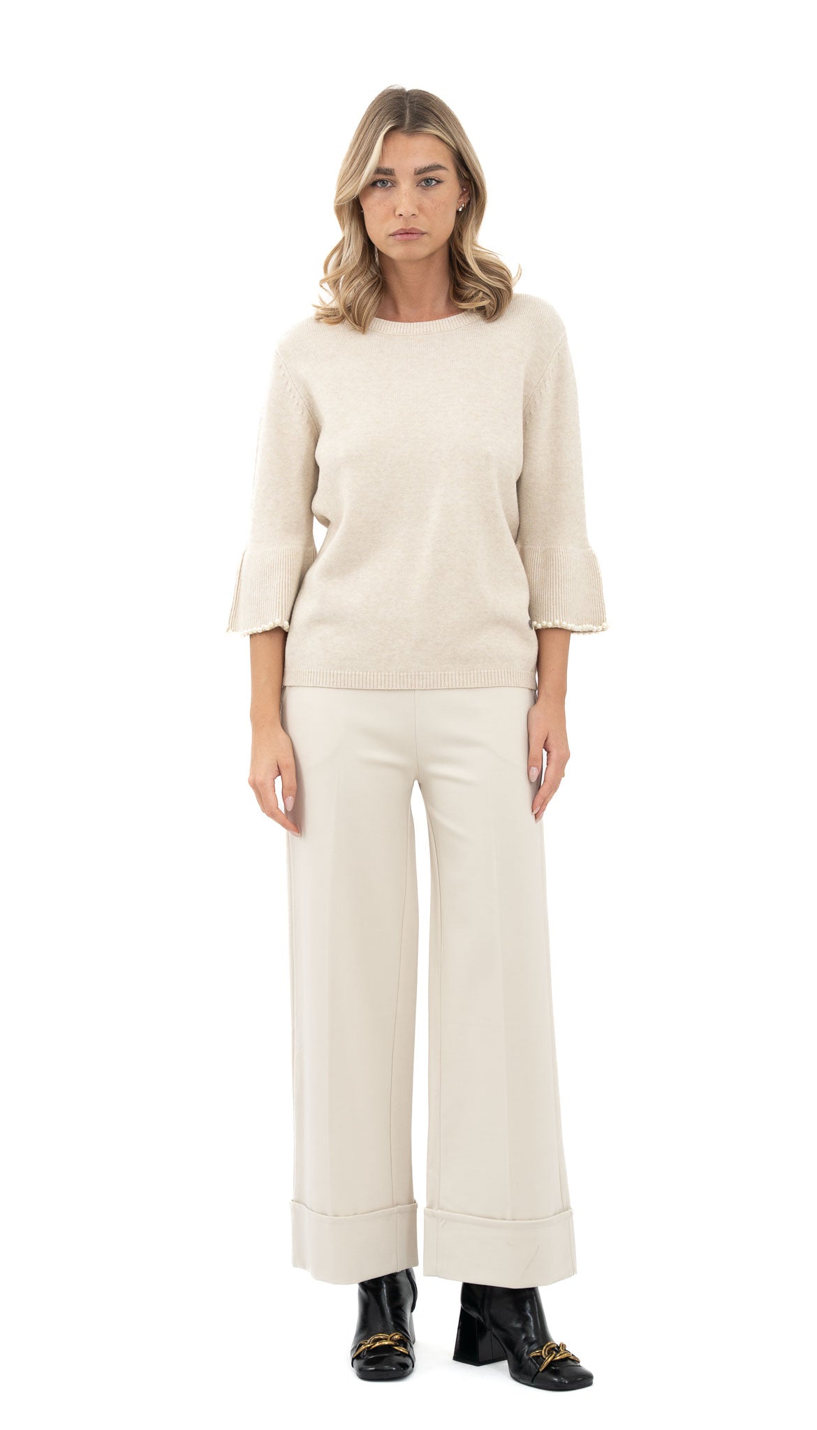 Kroj: Široki kroj do gležnja s naglašenim strukom.