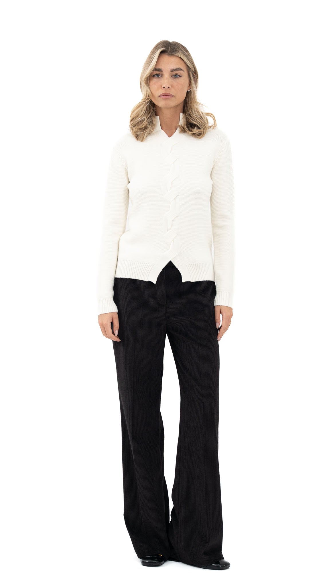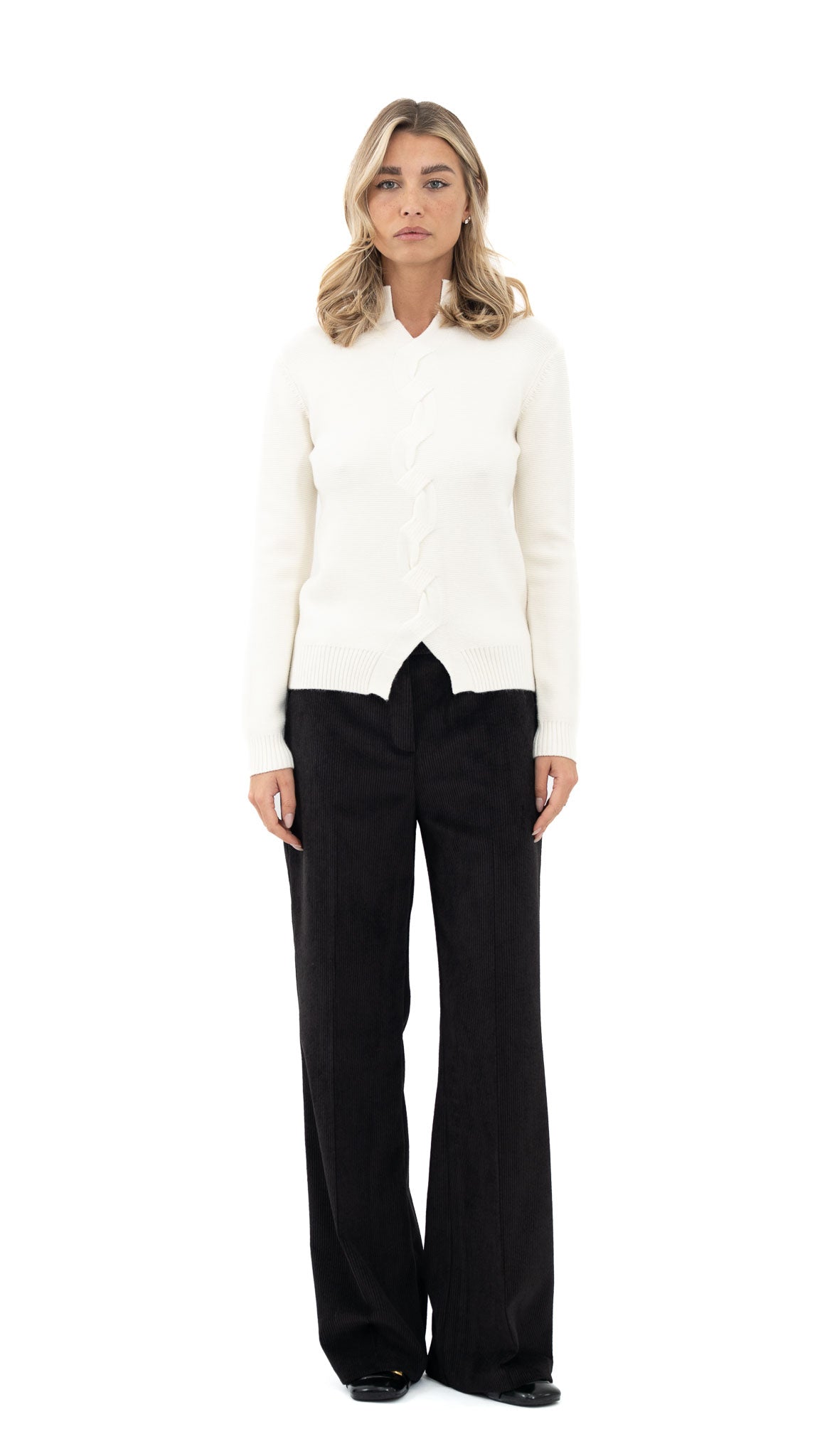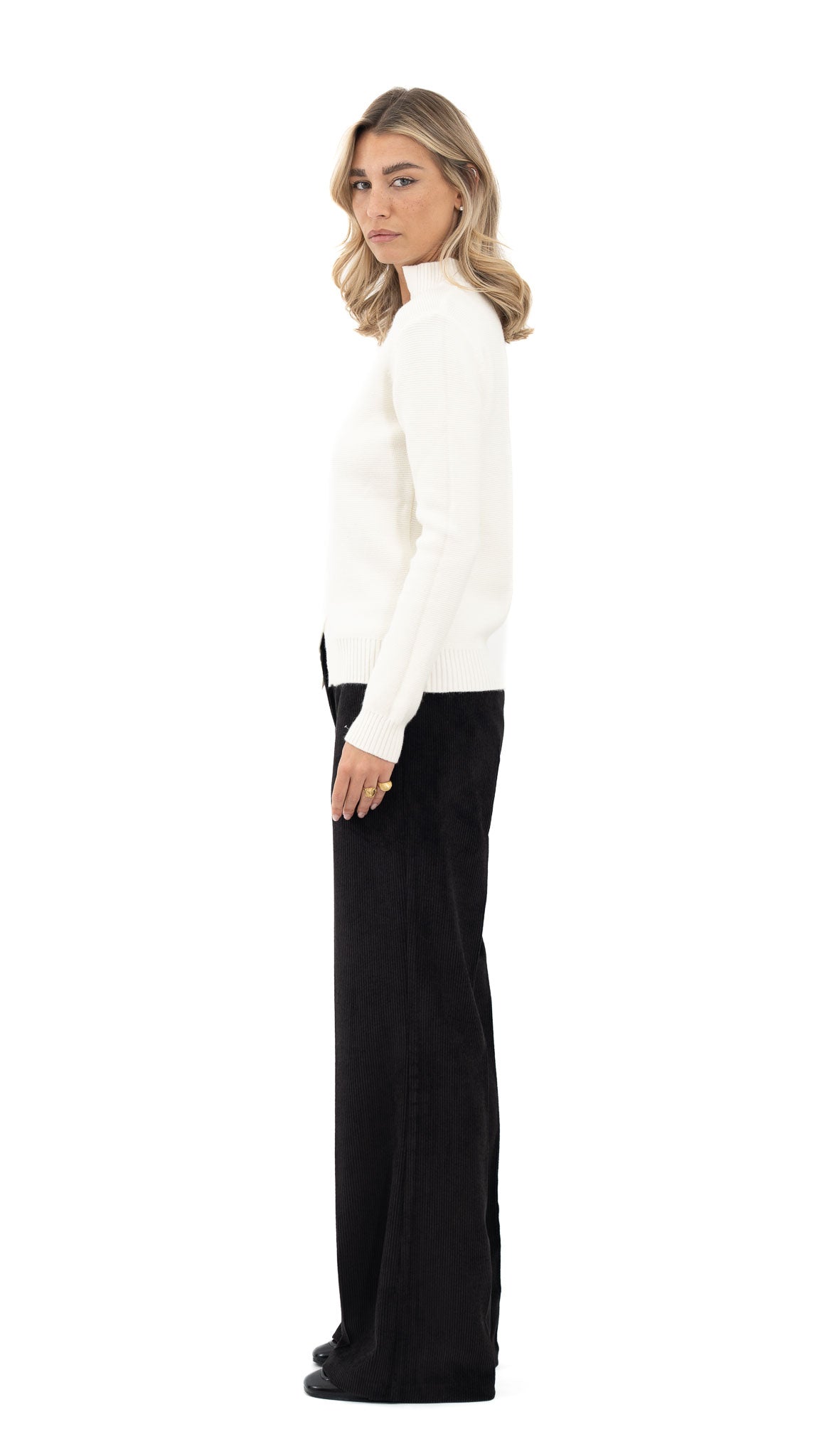 Crne hlače ravnog kroja s decentnim prugastim uzorkom. Izrađene od lagane viskoze koja osigurava udobnost i profinjen izgled tijekom cijelog dana.