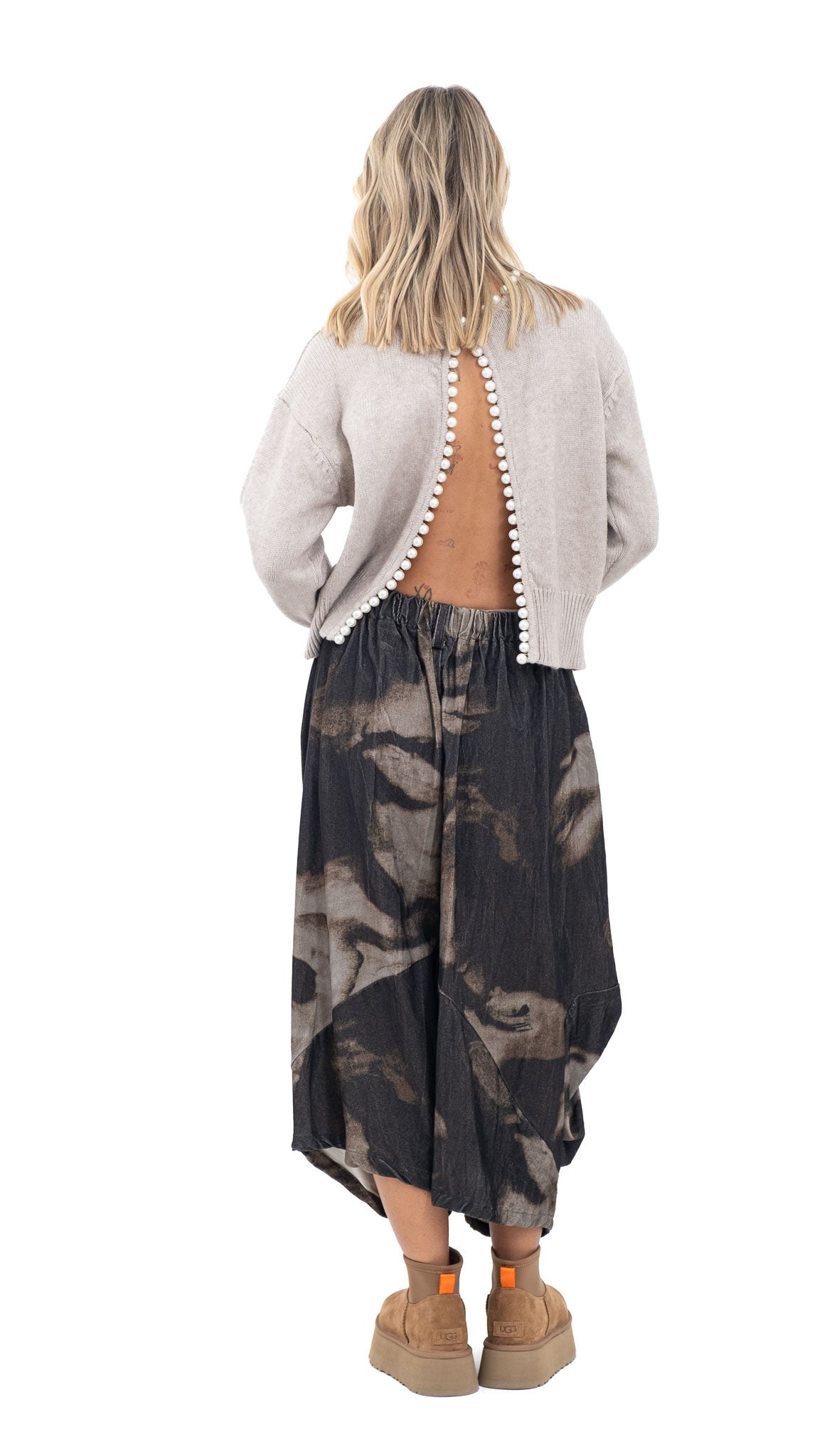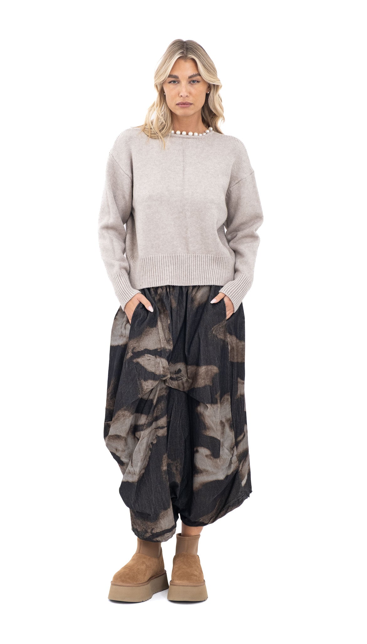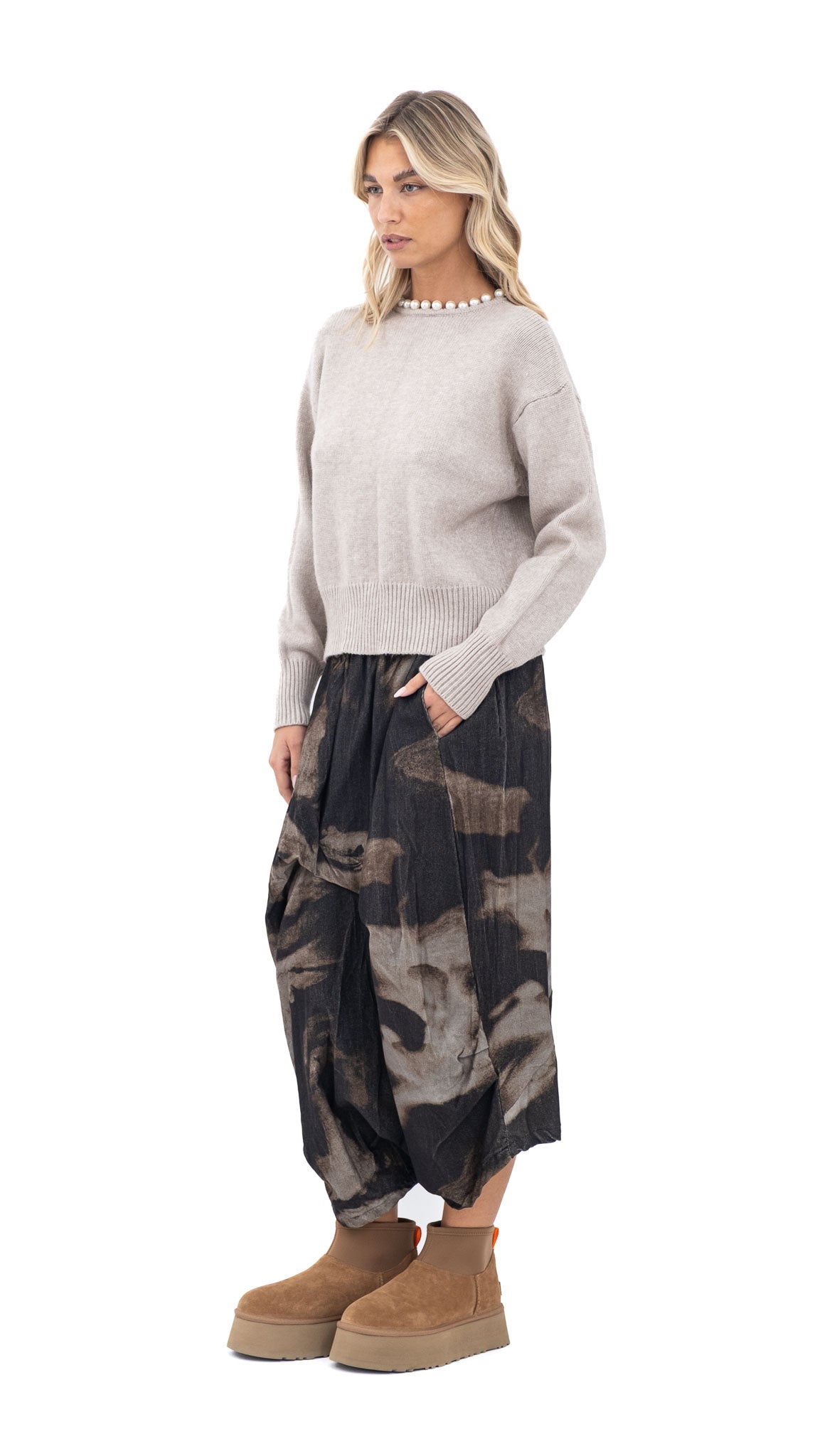 Crne hlače širokog, lagano balon kroja s efektom ručno rađenog uzorka u bež tonovima. Udobne, moderne i upečatljive — savršene za izražajan jesenski stil.