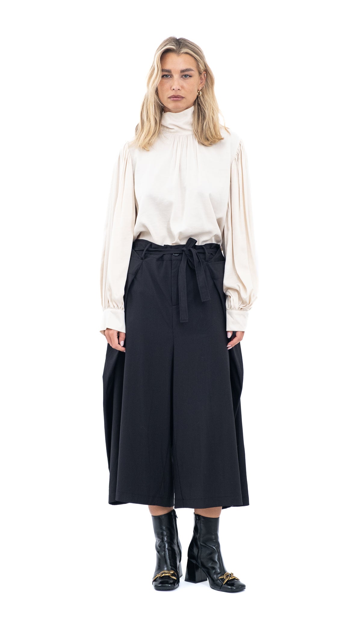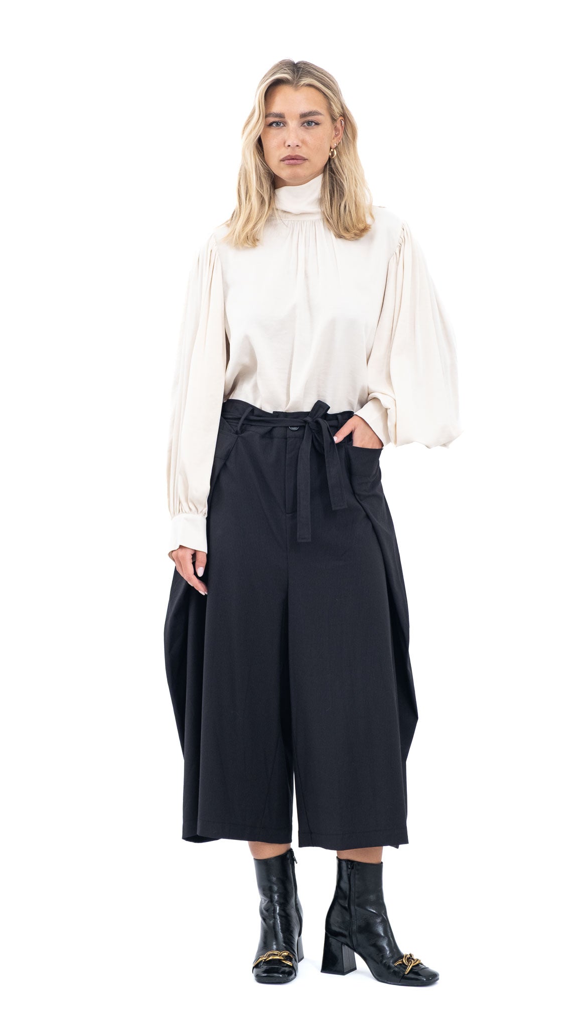 Elegantne i udobne crne hlače visokog struka s dekorativnim pojasom. Široke nogavice i lagani pad tkanine daju profinjen, ali opušten izgled koji pristaje svakoj silueti.