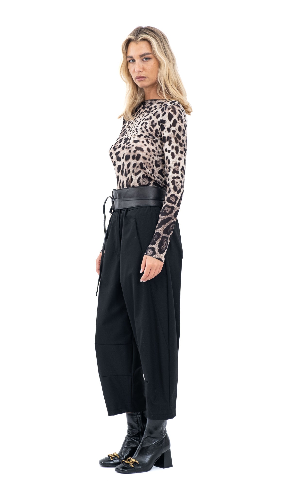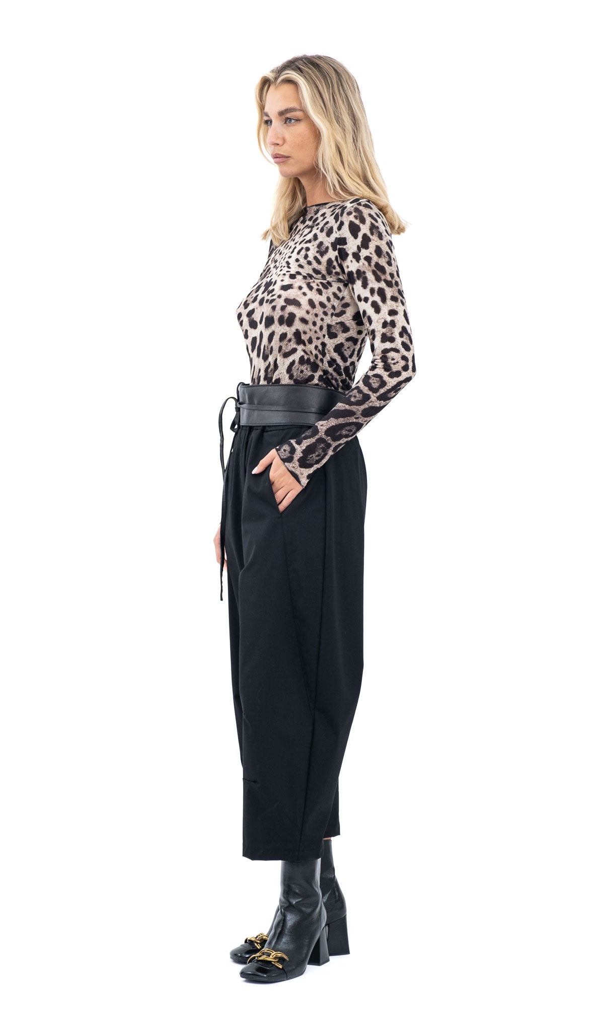 Moderne crne hlače s visokim strukom koji naglašava figuru. Izrađene od čvrstog, ali udobnog materijala koji pruža savršeno pristajanje i slobodu pokreta.