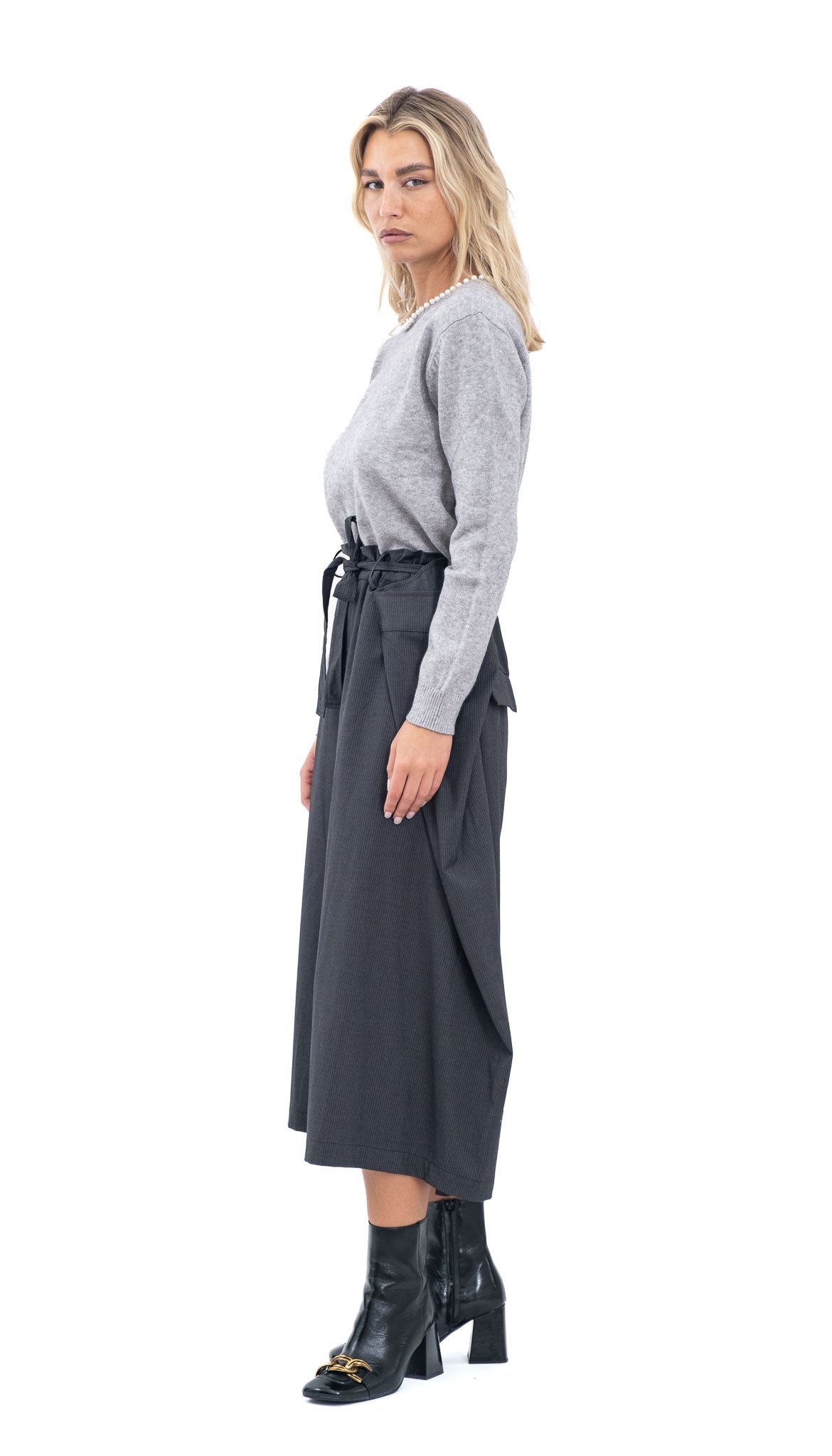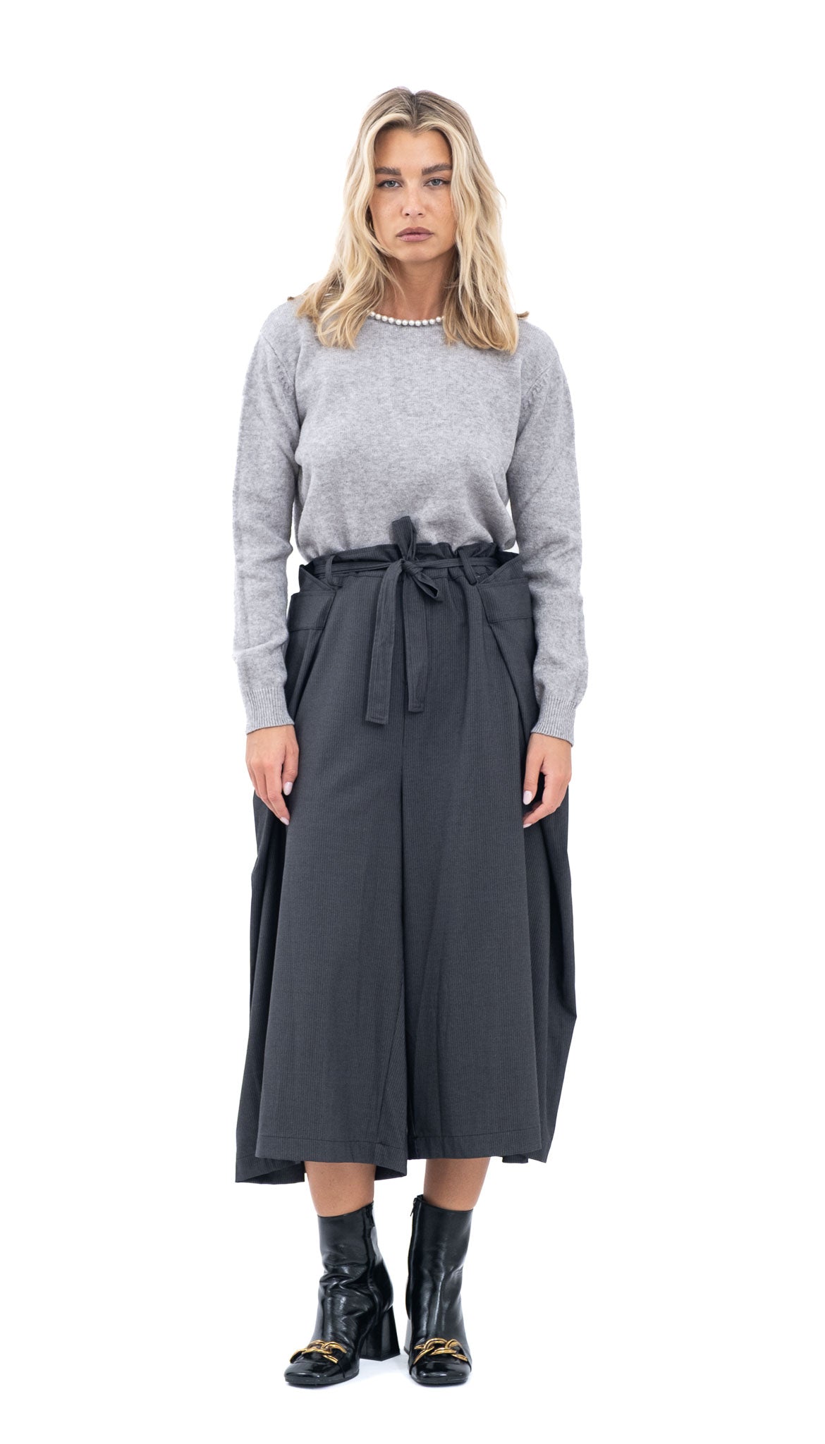 Tamnosive široke hlače izrađene od mekanog i laganog materijala, s visokim strukom i pojasom na vezanje. Udobne, moderne i savršene za svakodnevno nošenje ili poslovne kombinacije.