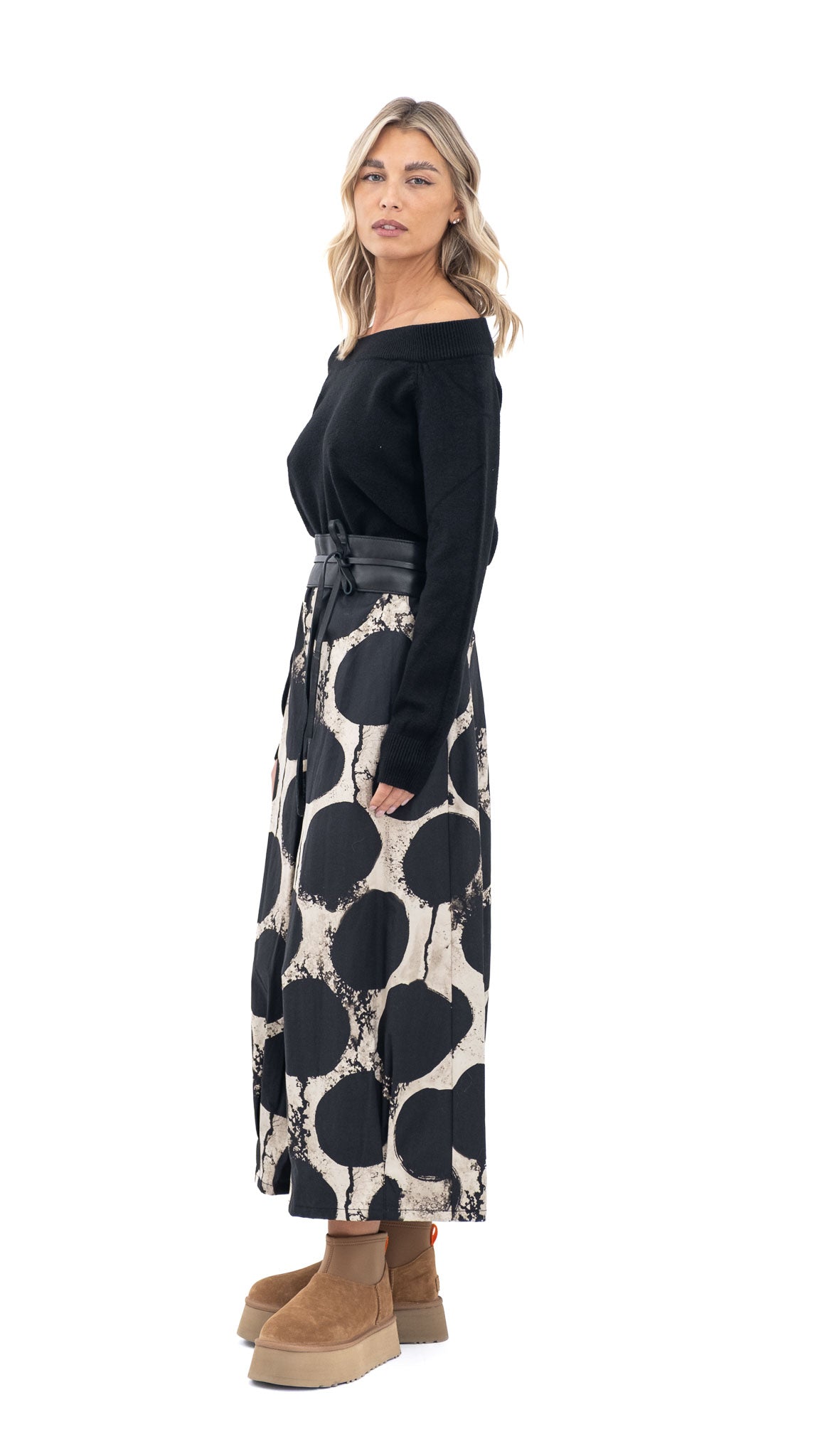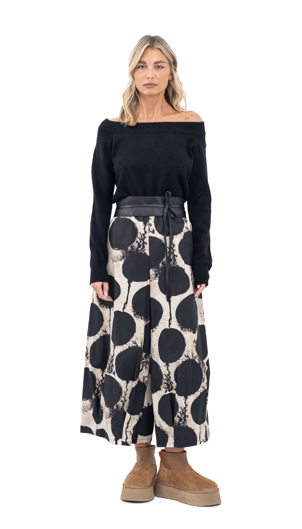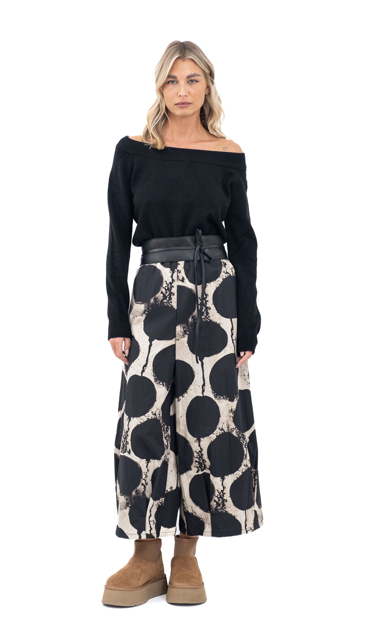 Moderan i umjetnički komad – hlače širokog kroja s upečatljivim kružnim uzorkom u crnoj i bež boji. Savršen izbor za one koji vole odjeću s karakterom i slobodom pokreta.