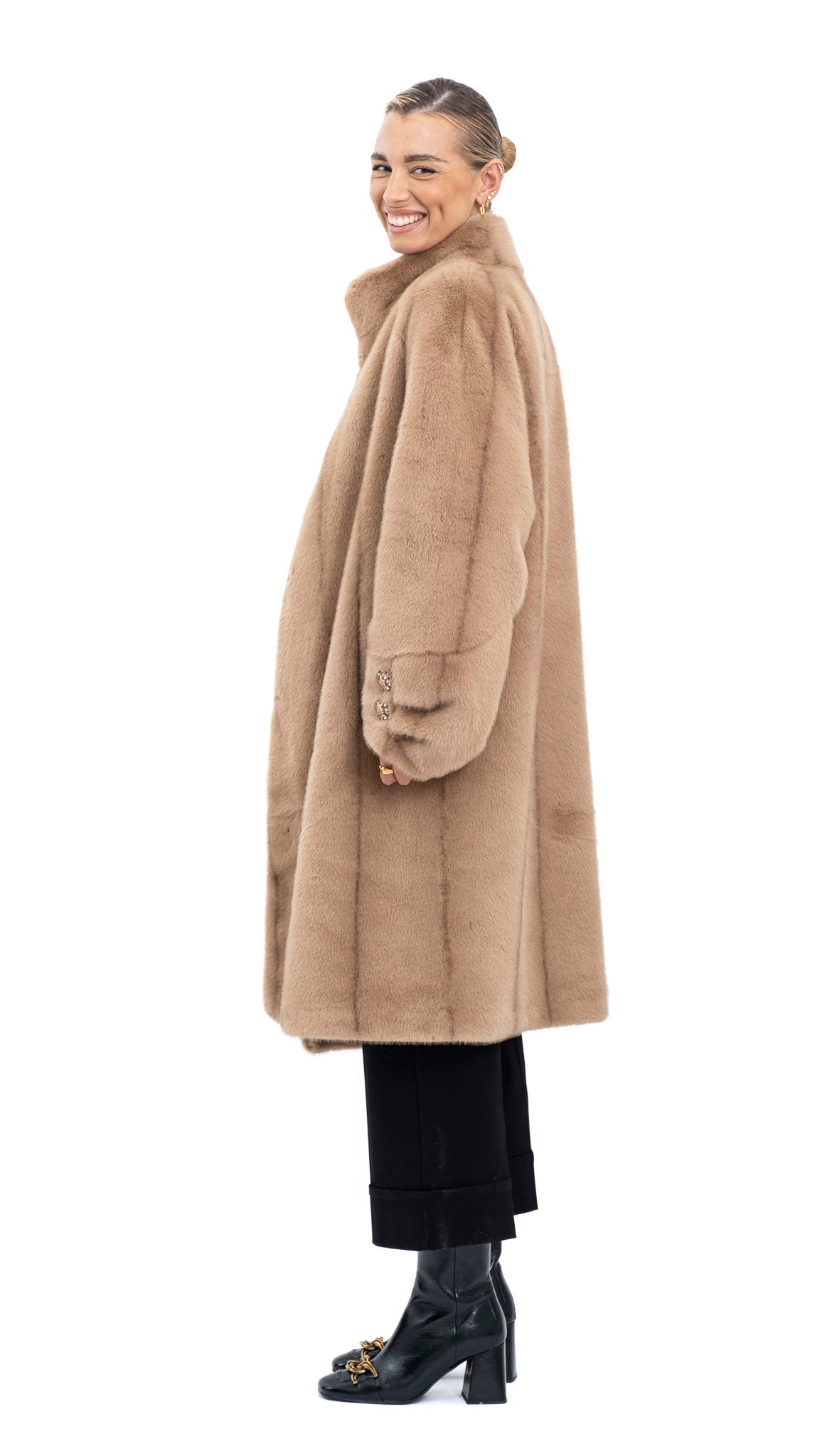 Ova prostrana bunda savršen je spoj udobnosti i elegancije. Sa svojim jednostavnim krojem i čistom caramel nijansom, lako će postati osnovni dio vaše garderobe.