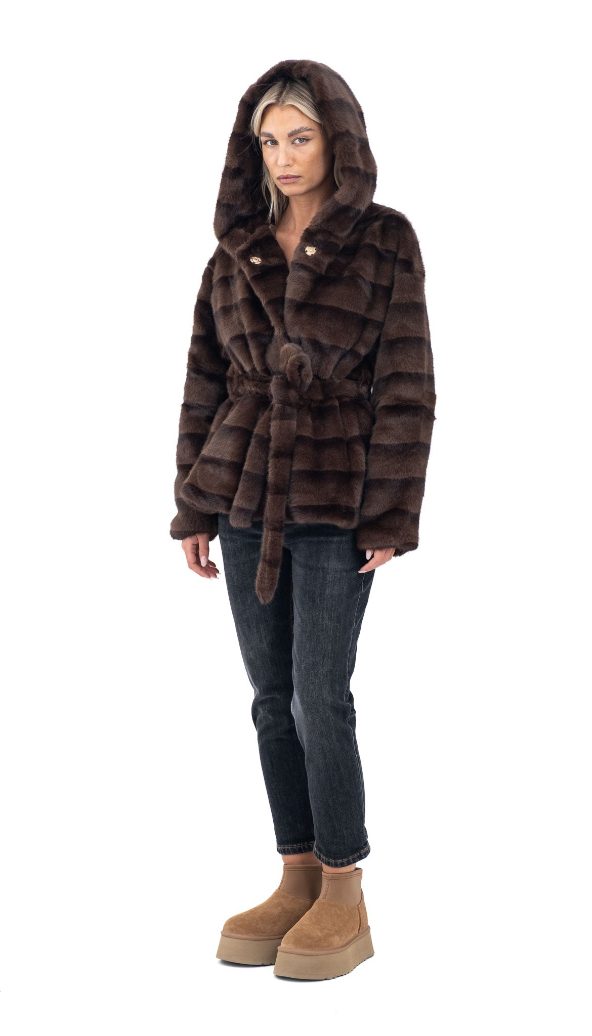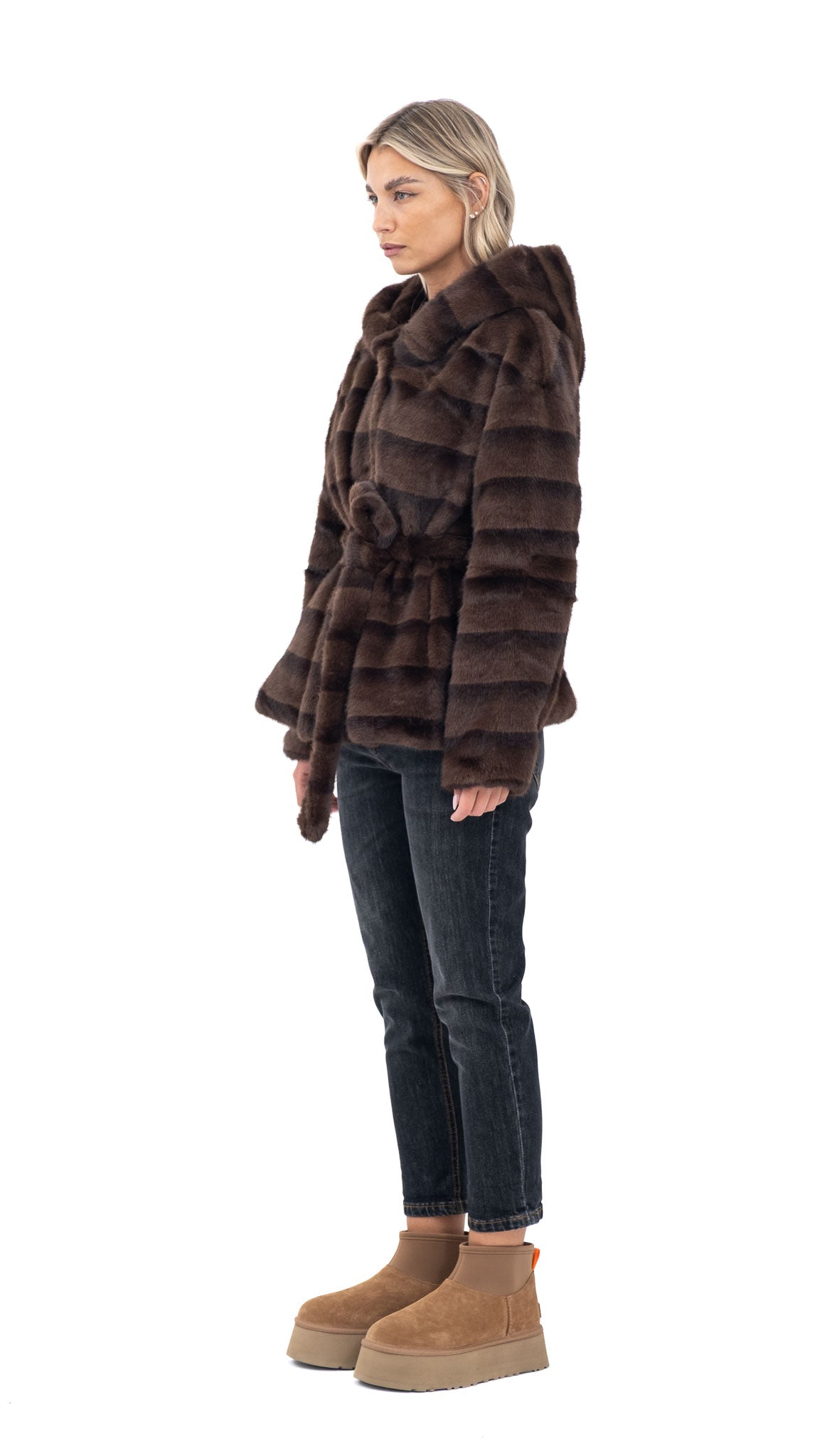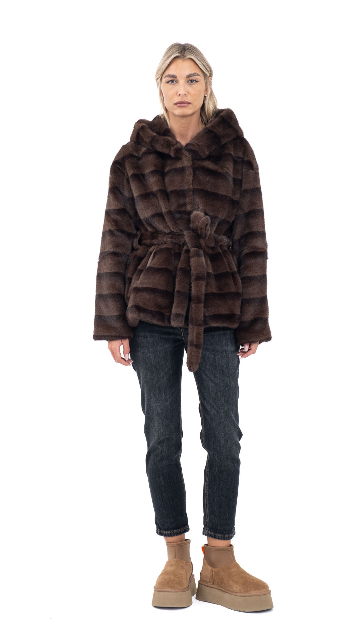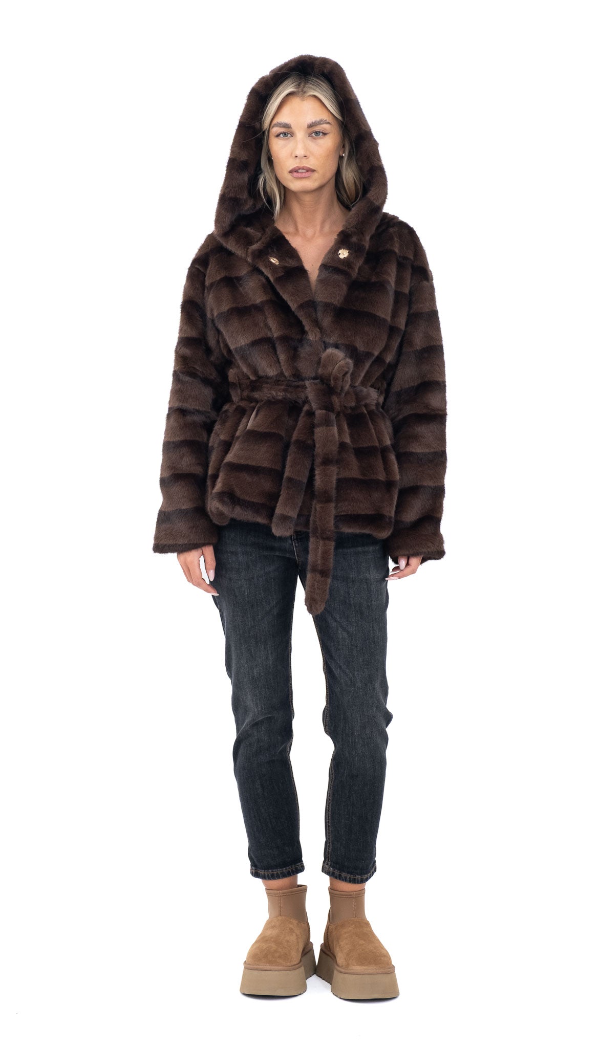 Topla i profinjena bunda od mekanog umjetnog krzna u bogatoj tamnosmeđoj boji. Zahvaljujući kapuljači i pojasu u struku, ovaj model pruža savršenu kombinaciju funkcionalnosti i ženstvenog izgleda. Savršen izbor za hladne dane kada želite izgledati moderno i osjećati se ugodno.