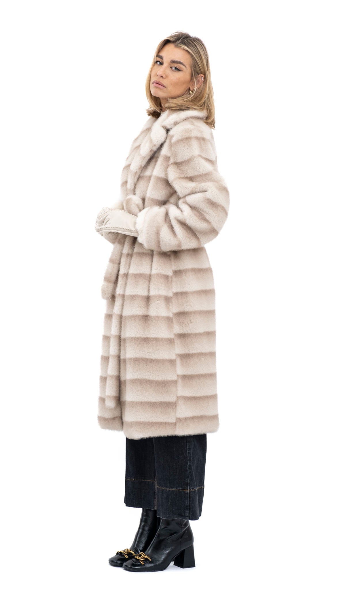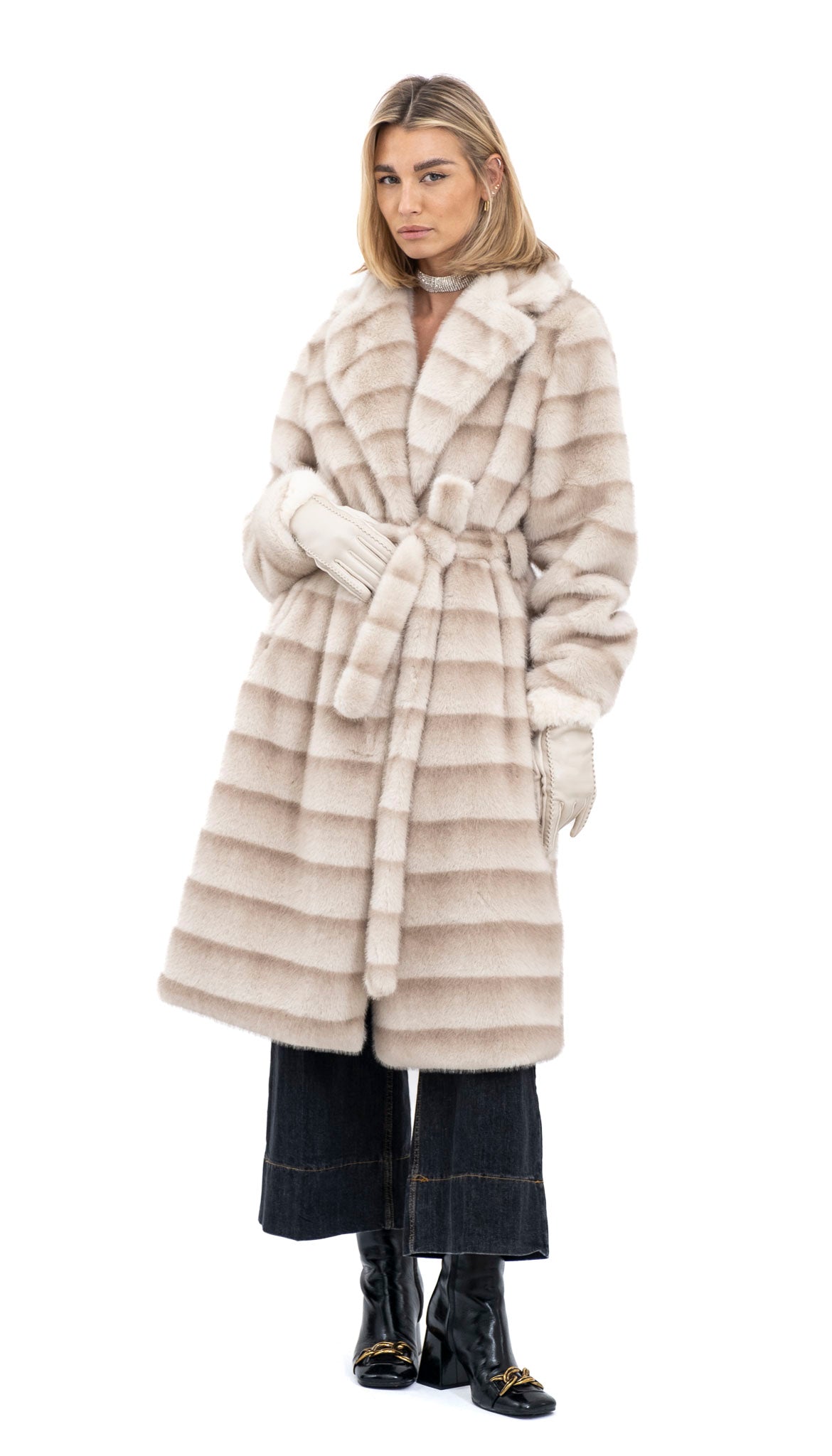 Opis proizvoda: Prekrasna duga bunda u bež nijansi, izrađena od kvalitetnog umjetnog krzna. Trakasti uzorak dodaje teksturu i dimenziju ovom komadu, čineći ga elegantnim odabirom za hladne dane. S remenom za vezanje u struku, pruža profinjen izgled i omogućuje prilagodbu siluete.