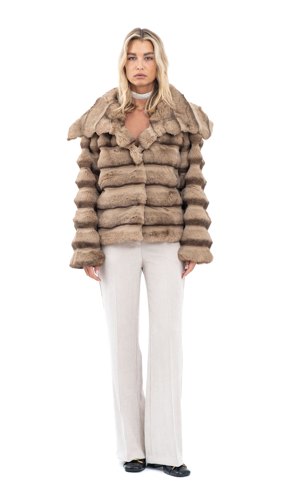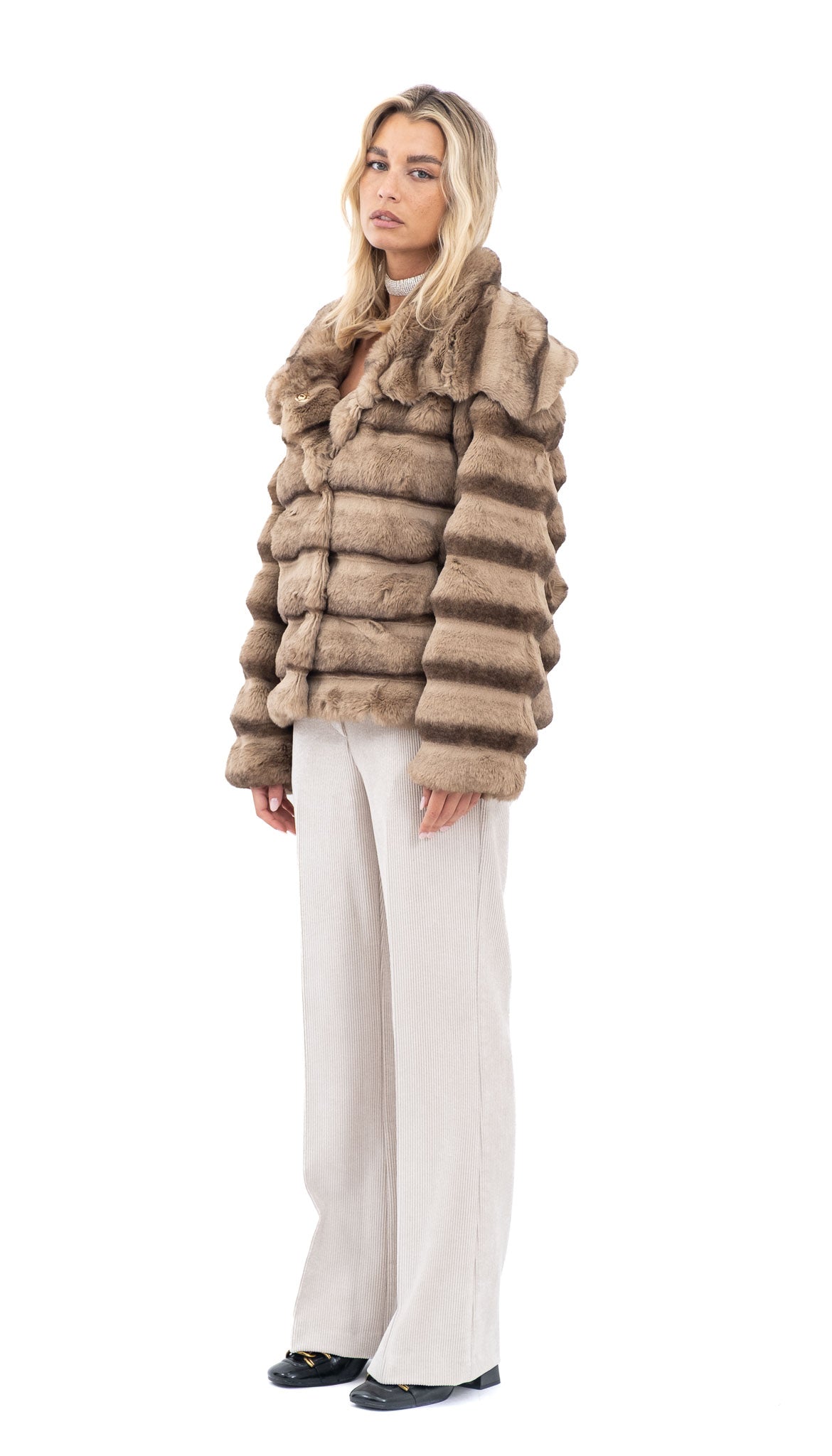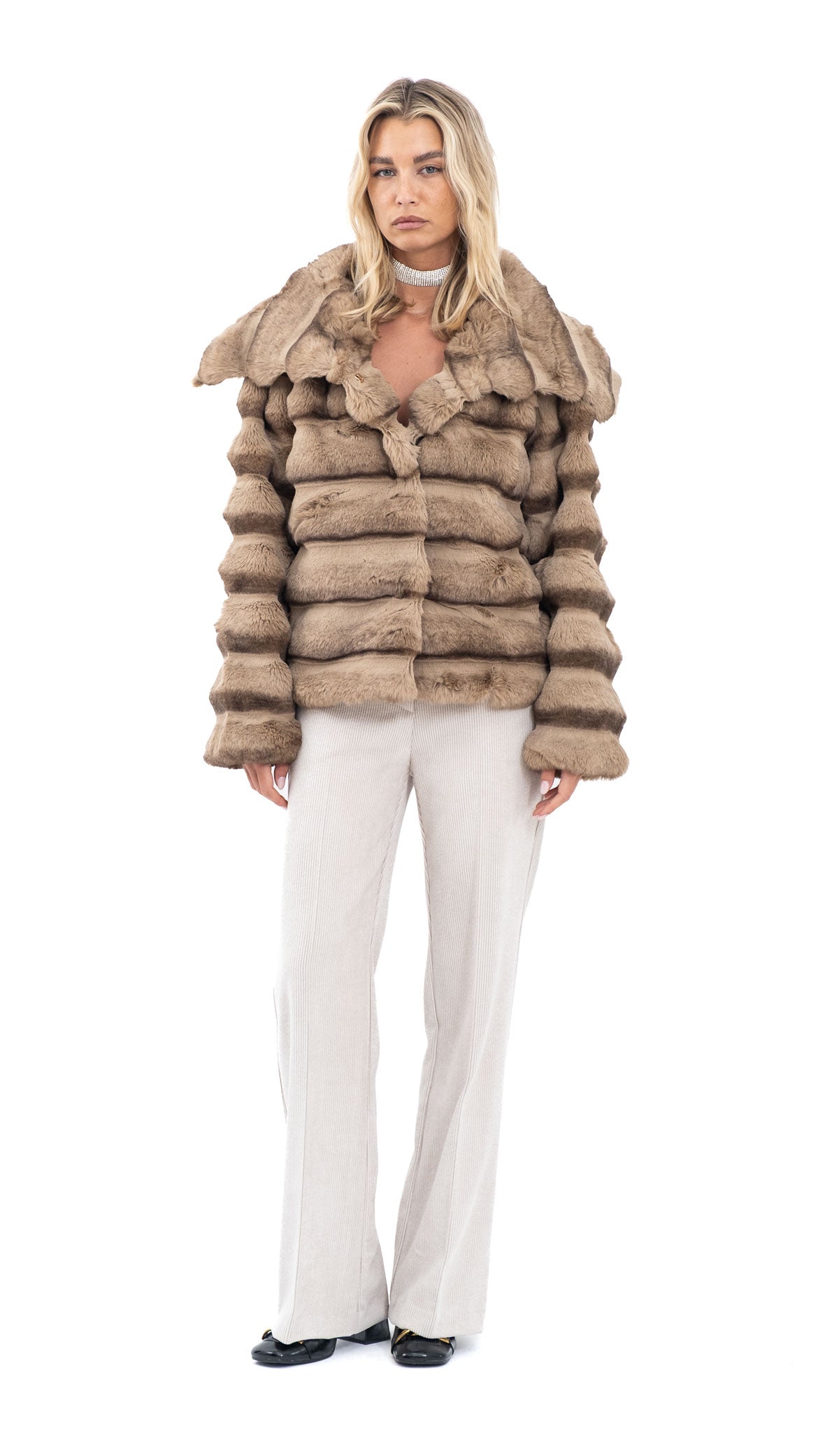 Karamel bunda od mekanog umjetnog krzna s raskošnim ovratnikom i klasičnim kopčanjem sprijeda. Topla i ugodna, idealna za zimske dane i profinjene modne kombinacije.