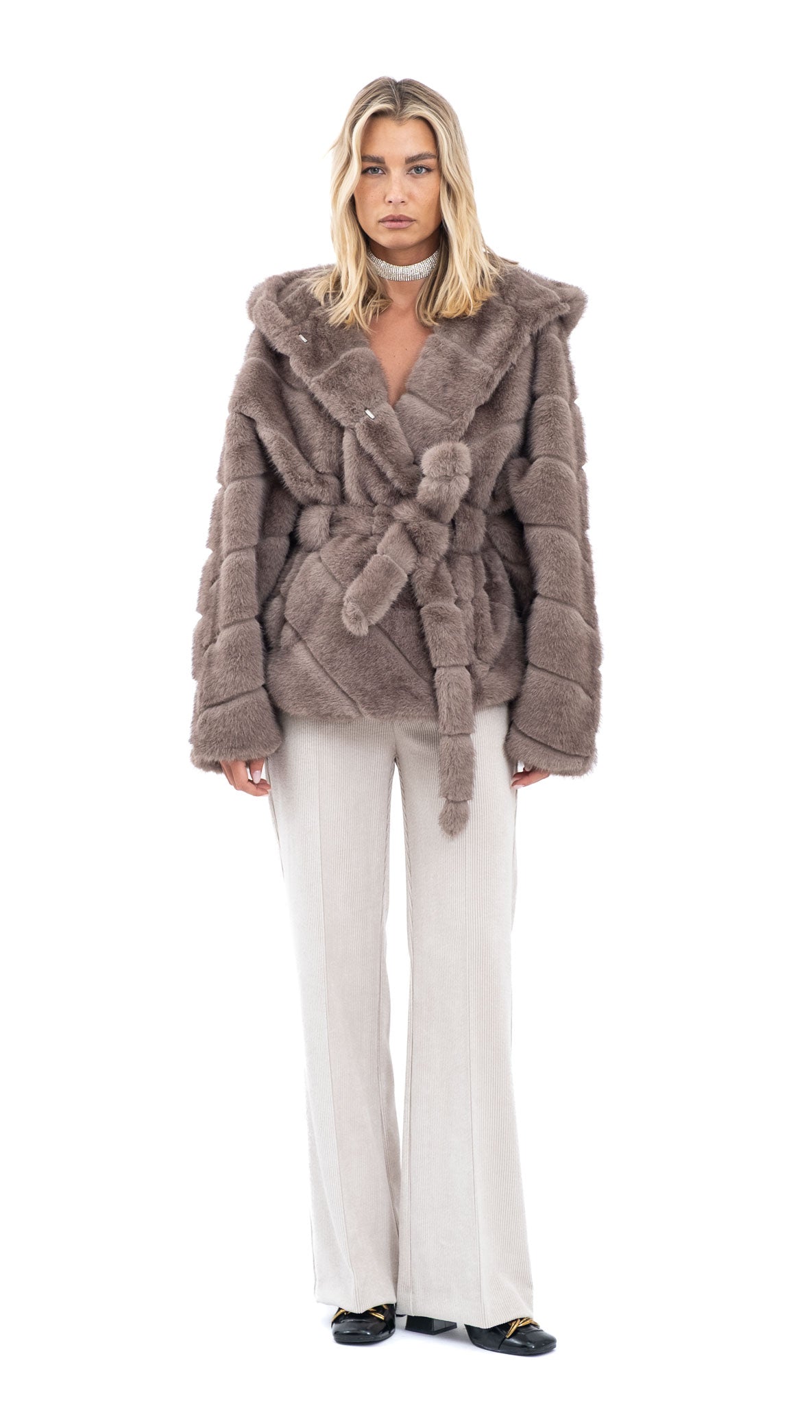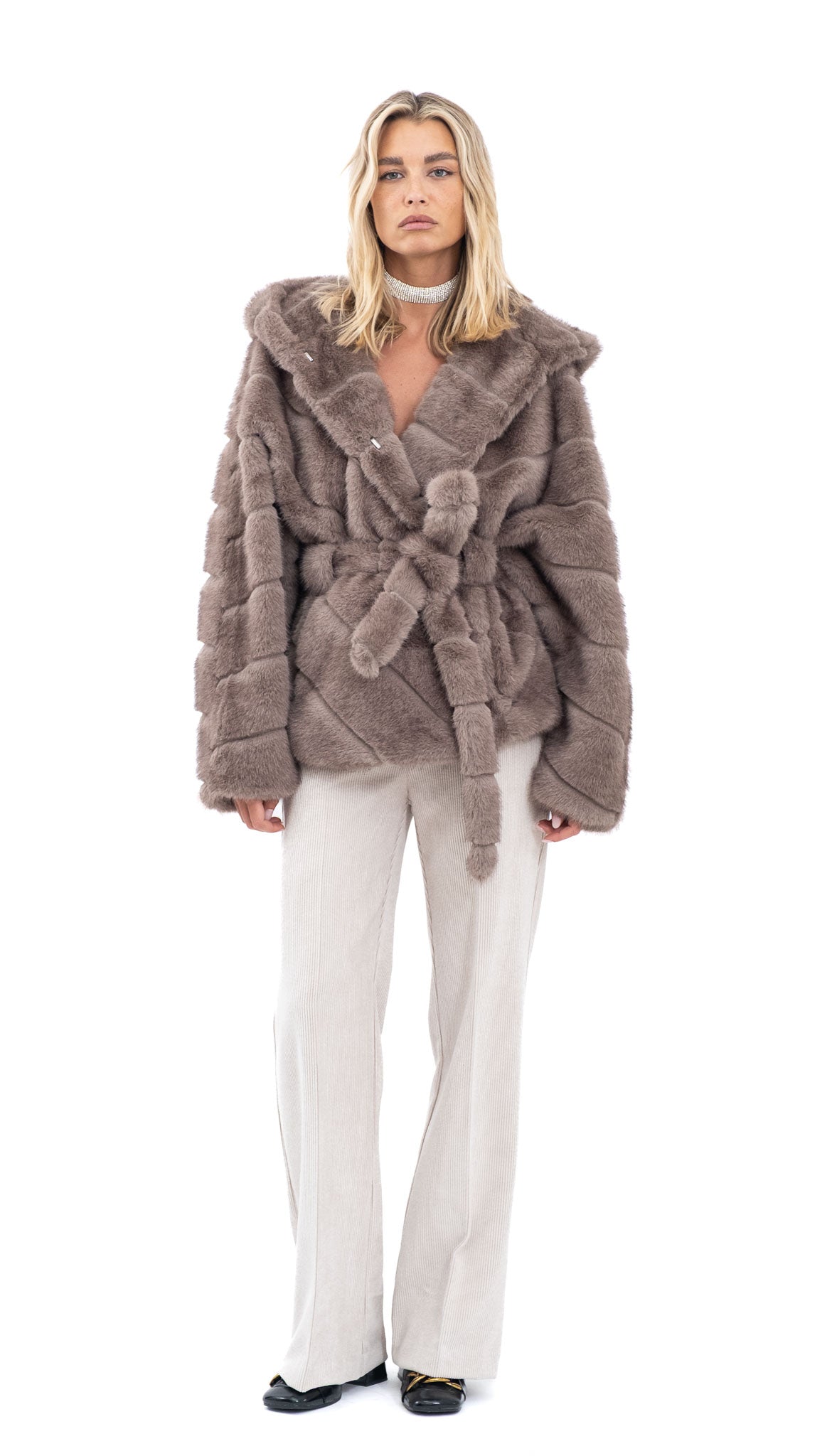 Sivo smeđa bunda od mekanog umjetnog krzna s kapuljačom i pojasom u struku. Udobna, topla i raskošna, idealna za hladne zimske dane i profinjene kombinacije.