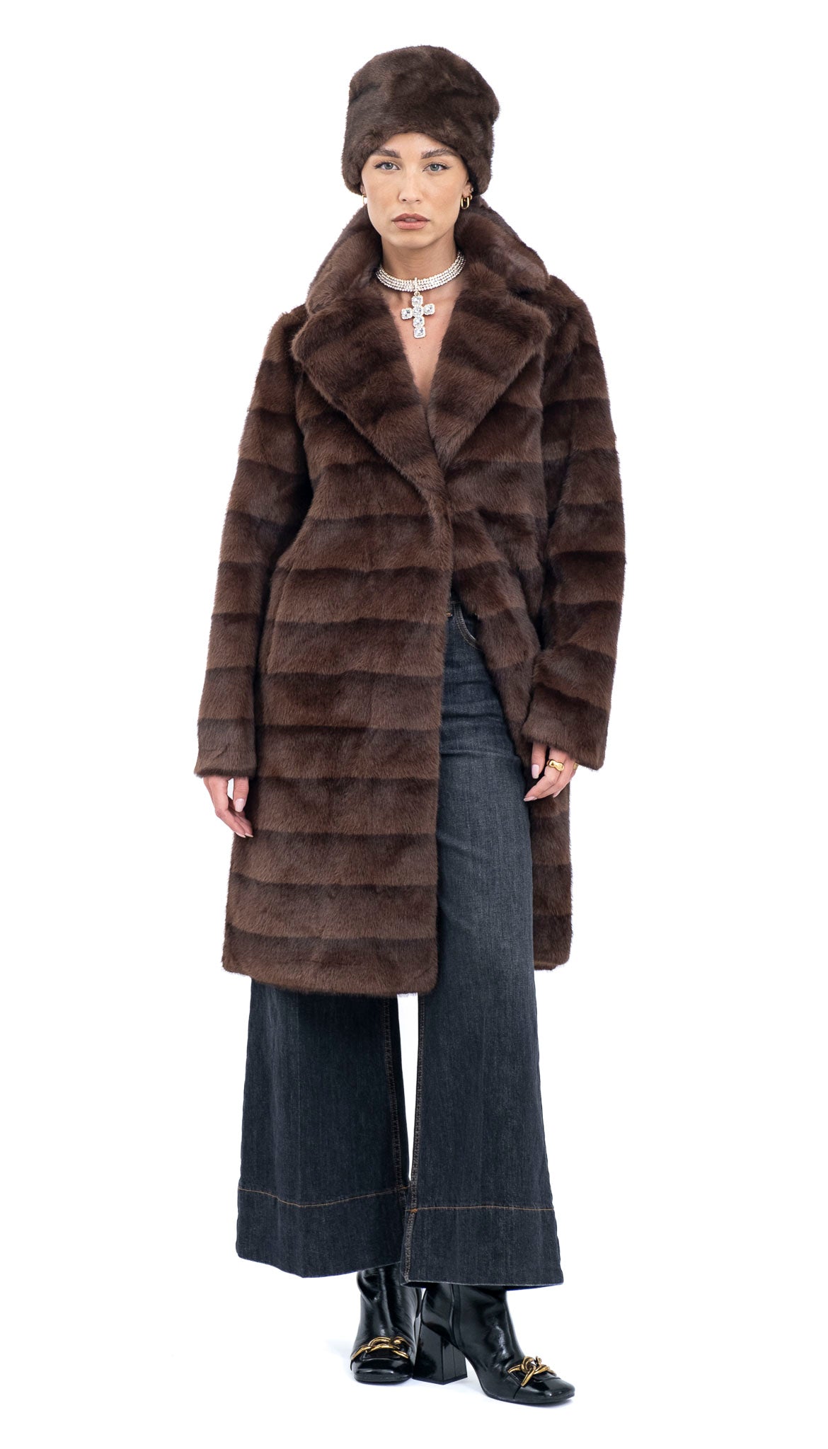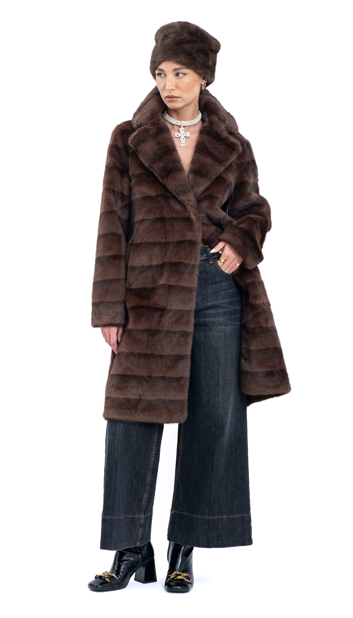 Ova luksuzna smeđa bunda unosi dozu elegancije u svaki zimski outfit. S raskošnim dizajnom i toplinom, savršena je za hladnije dane i večernje prigode.