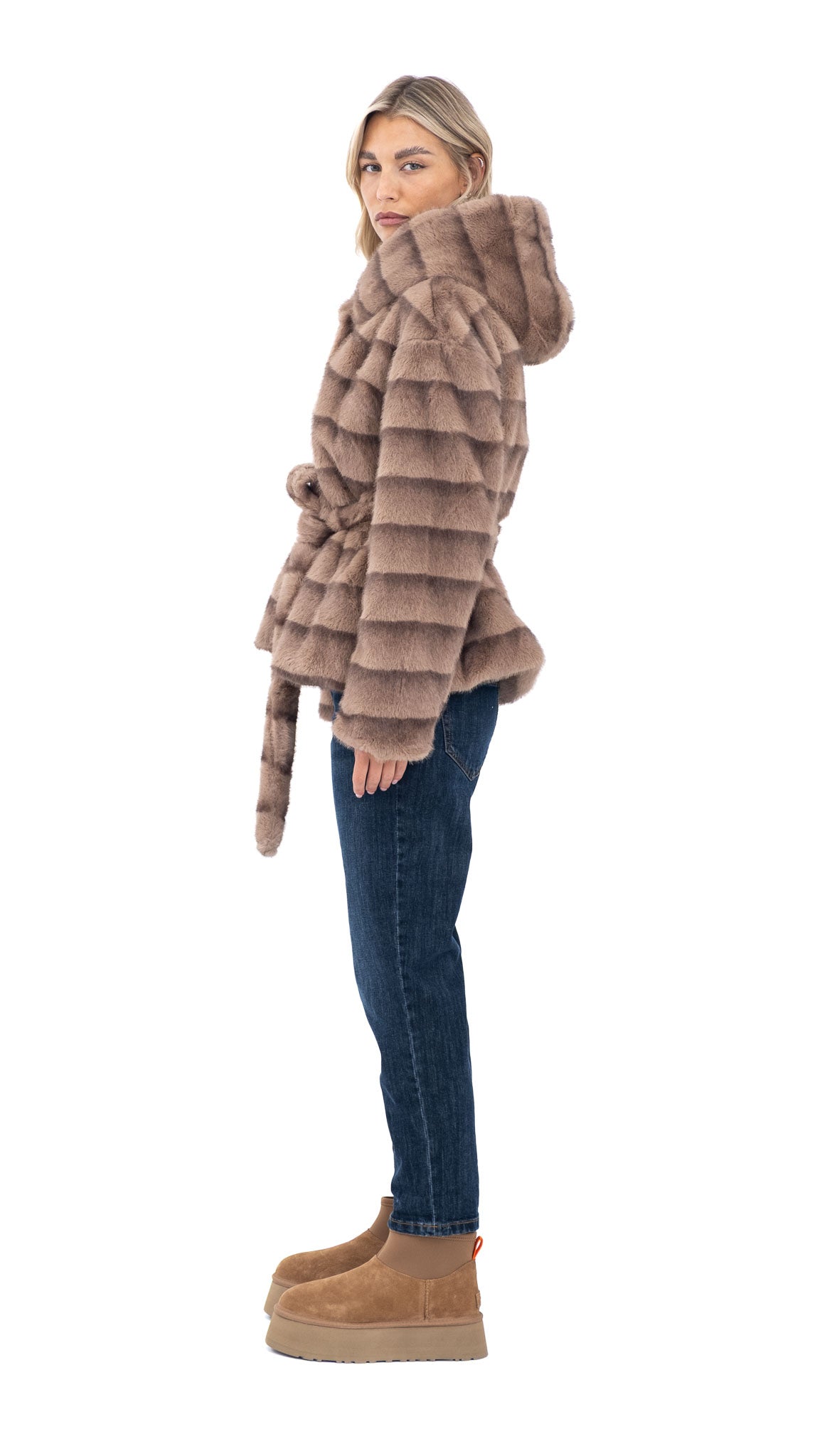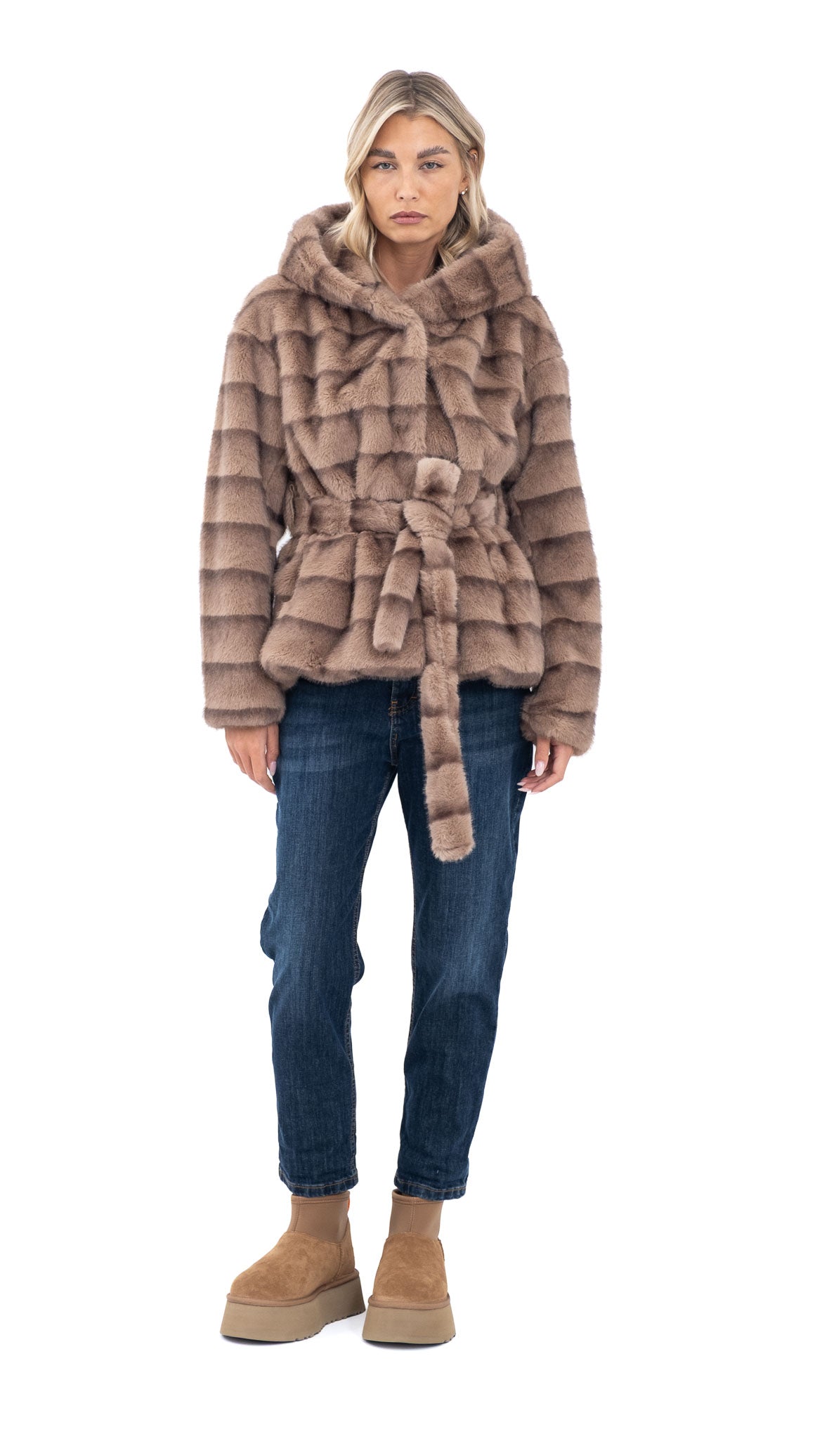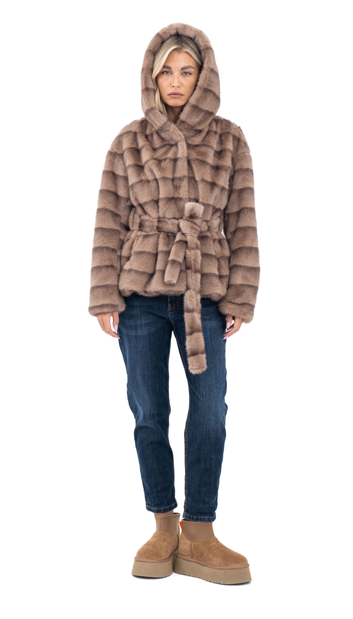 Mekana i moderna bunda od umjetnog krzna u toploj smeđoj nijansi s decentnim uzorkom. Model s kapuljačom i pojasom u struku pruža savršenu kombinaciju topline, udobnosti i stila. Idealna za hladne dane kada želite unijeti dozu luksuza u svakodnevni izgled.