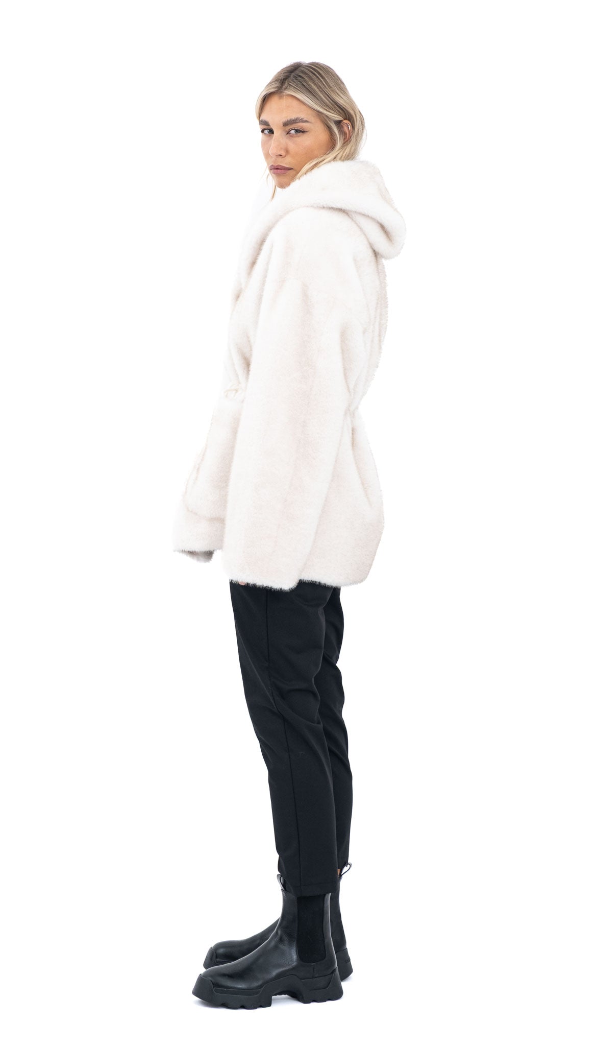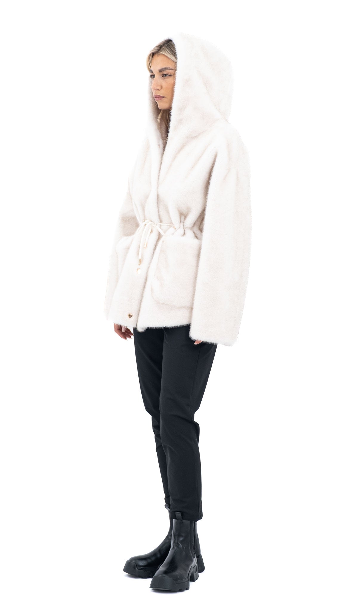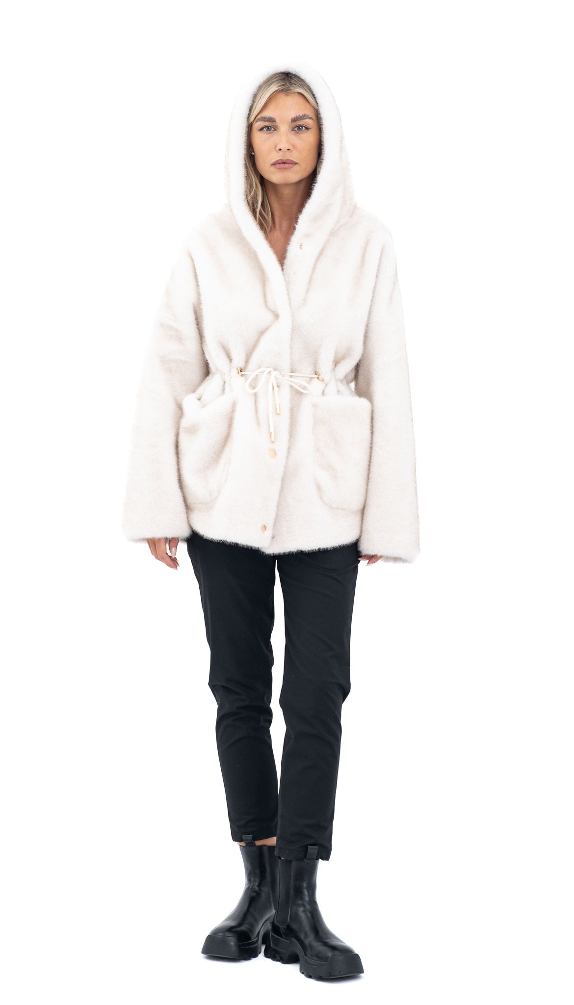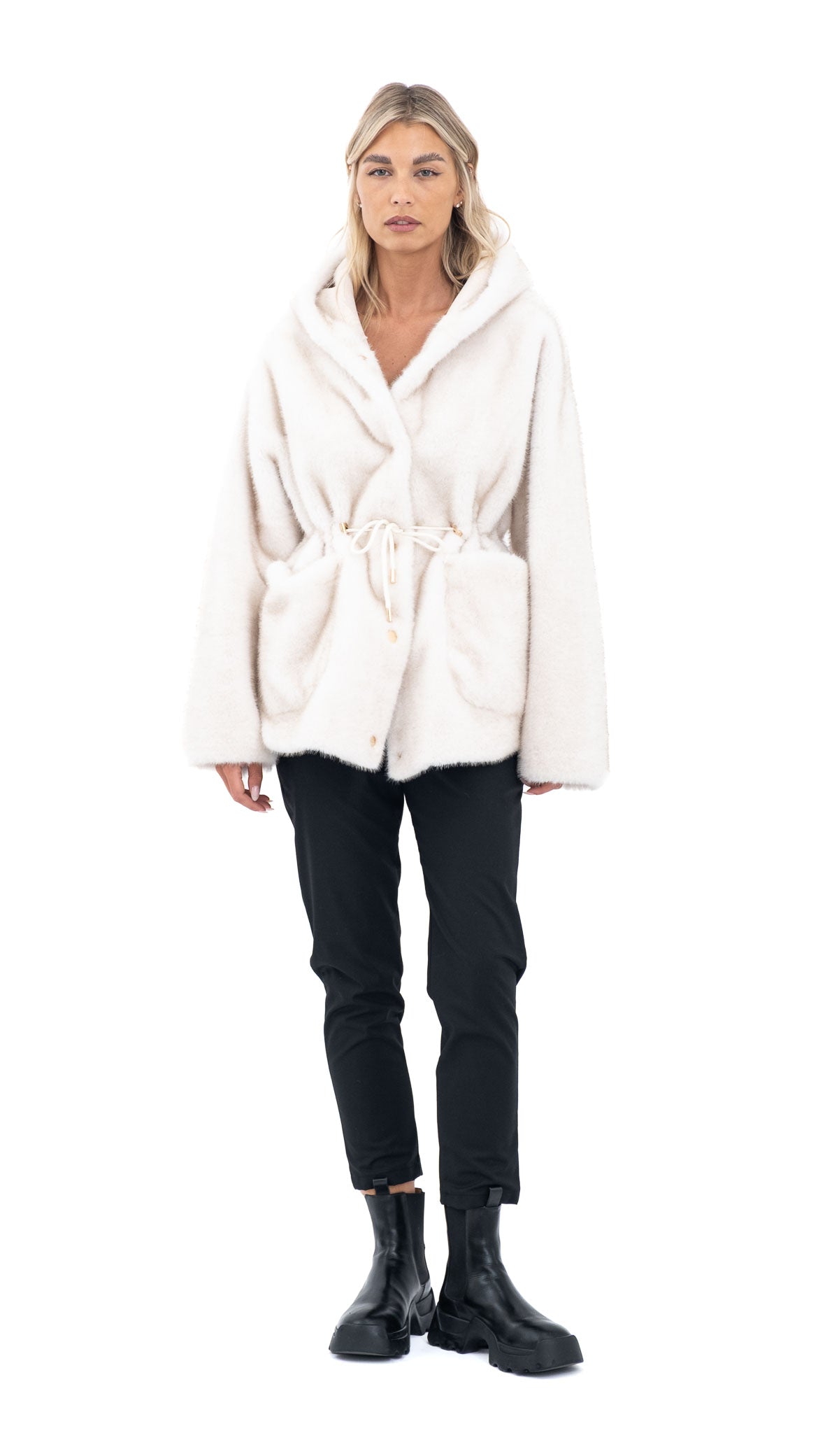 Udobna i moderna bunda izrađena od mekanog umjetnog krzna u svijetloj bež nijansi. Kapuljača i podesiva vezica u struku omogućuju prilagodbu prema želji, dok topli materijal pruža savršenu zaštitu od hladnoće. Idealna za svakodnevno nošenje u hladnijim danima uz dozu profinjenog stila.
