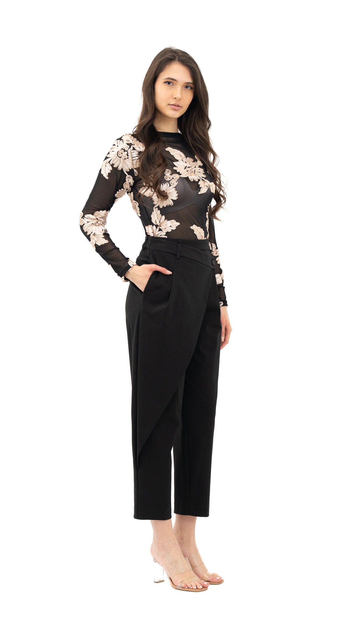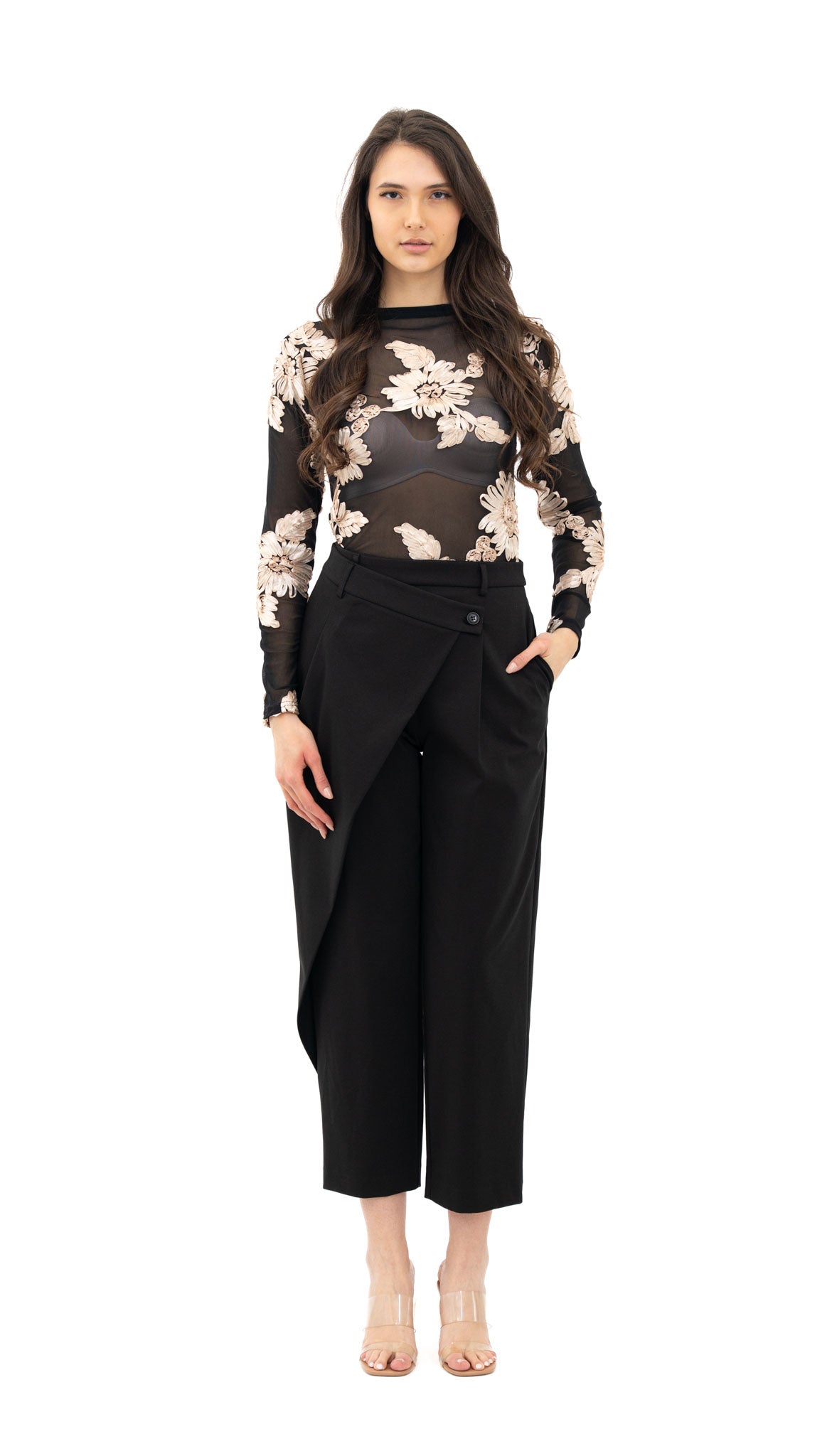 Model: Uska, prozirna sa aplikacijom cvijeća. Izrađena od umjetnih vlakana.