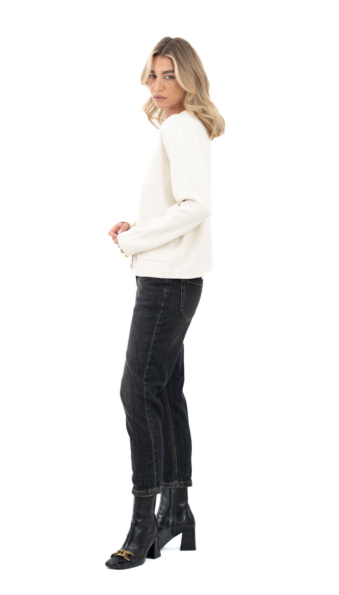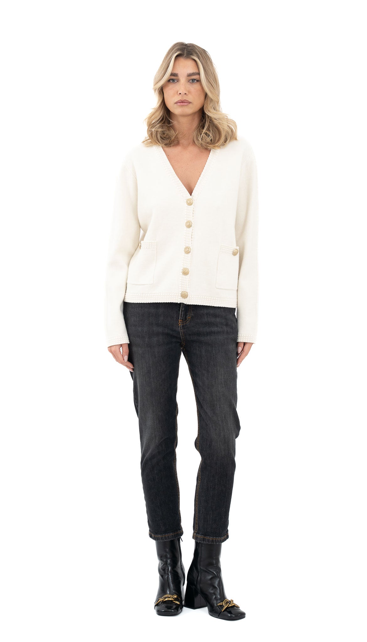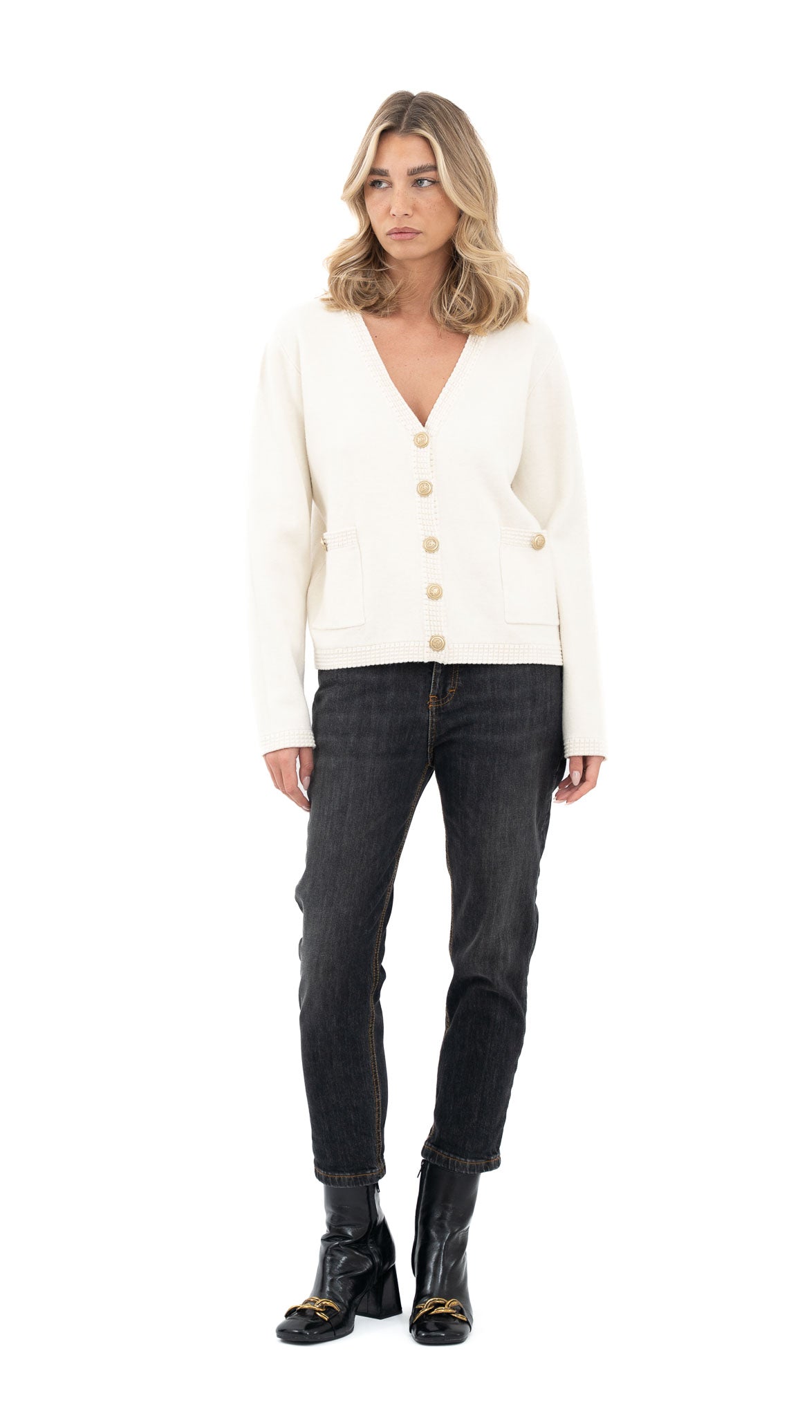 Kardigan svijetle boje s V-izrezom i gumbima sprijeda, izrađen od ugodnog materijala koji lijepo prati liniju tijela. Praktičan i svestran komad za svakodnevno nošenje.