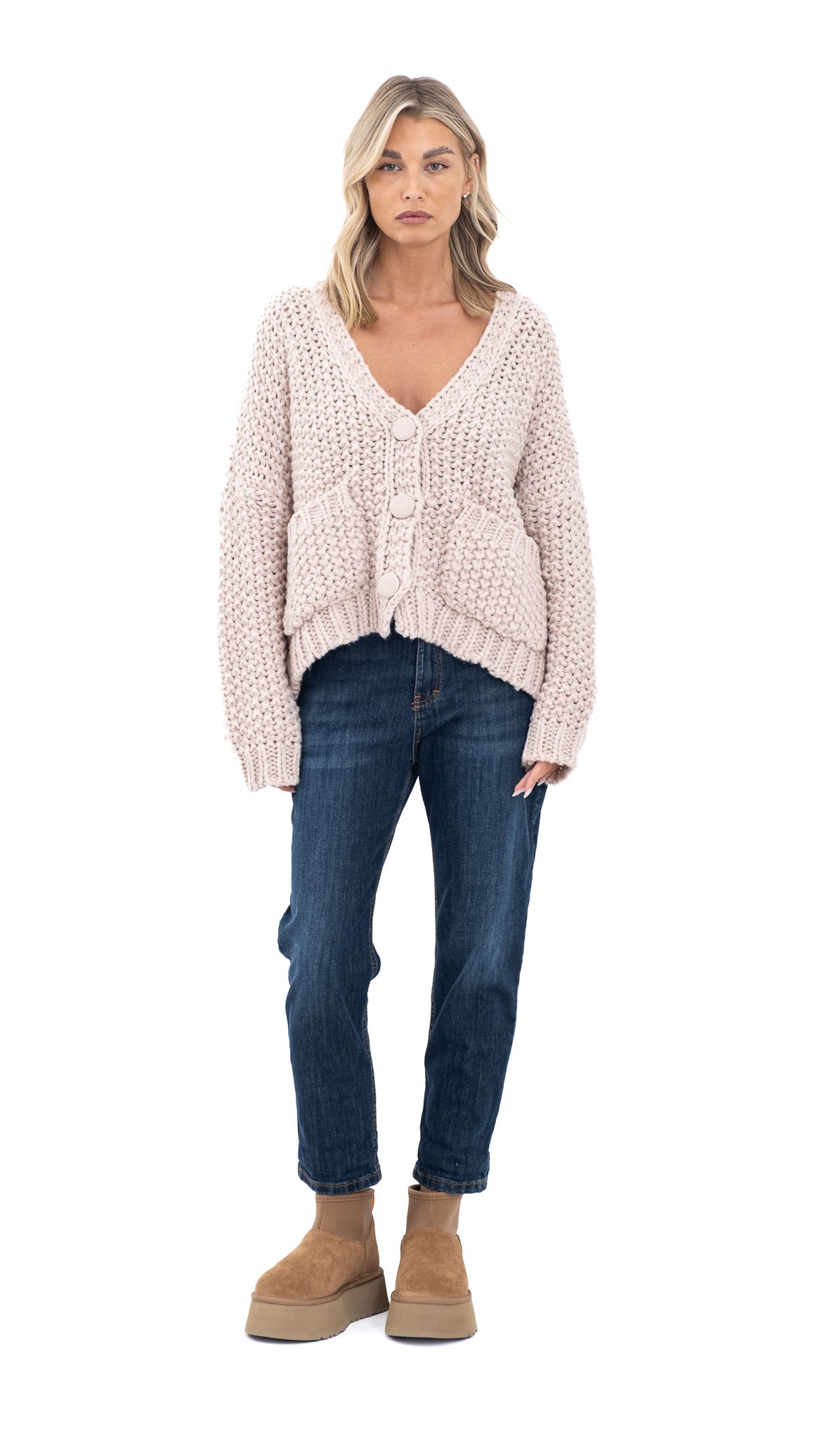 Kardigan boje pudera od viskoze s V-izrezom i velikim gumbima. Udoban, mekan i idealan za ležerne kombinacije.