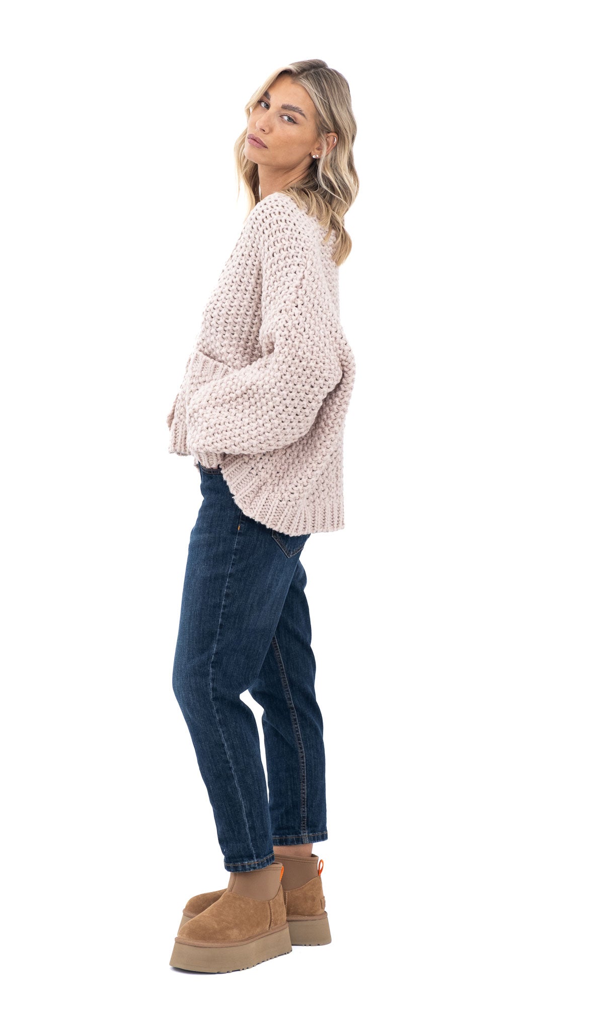 Dizajn: Krupno pletivo s prednjim džepovima i gumbima.