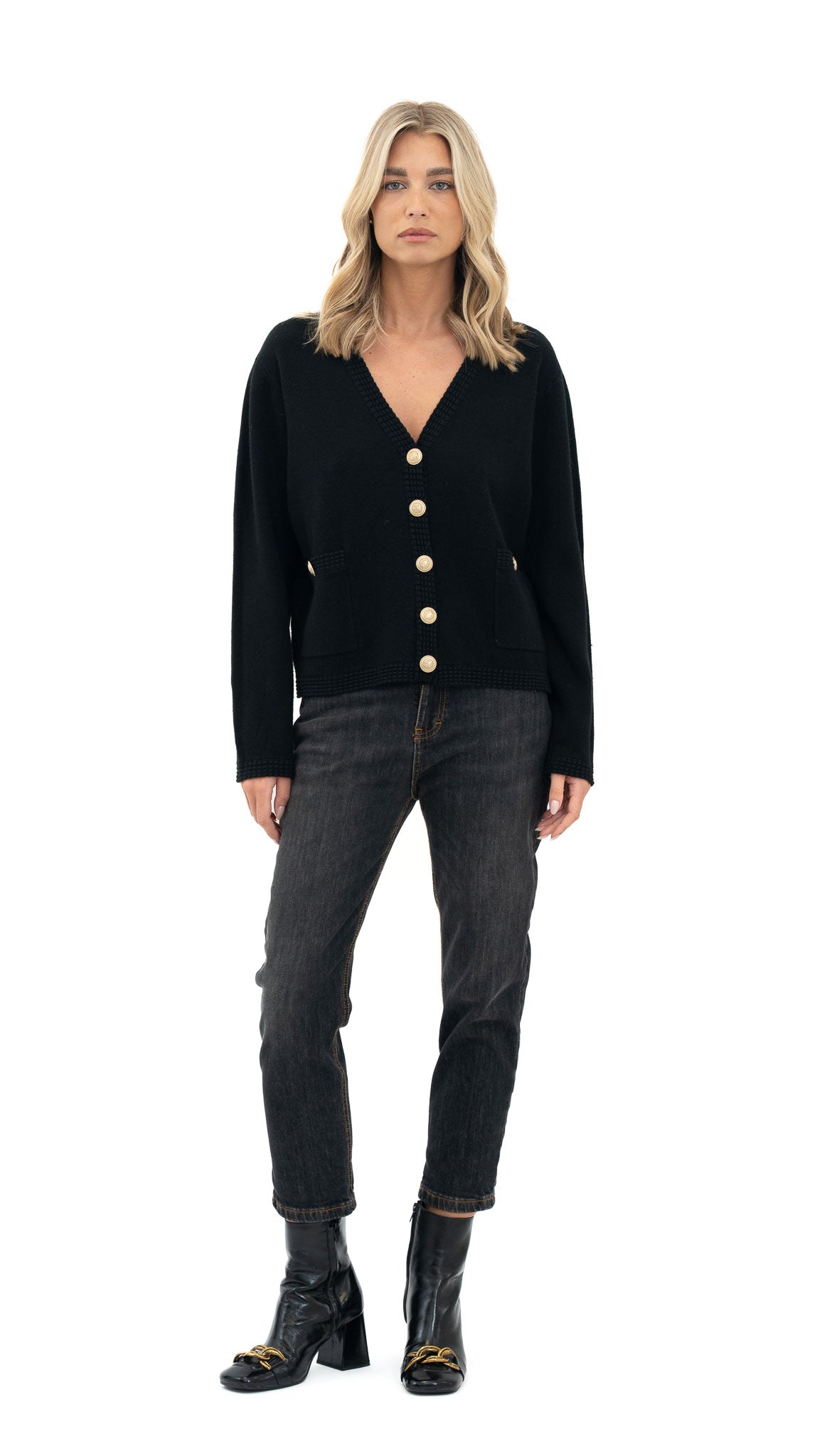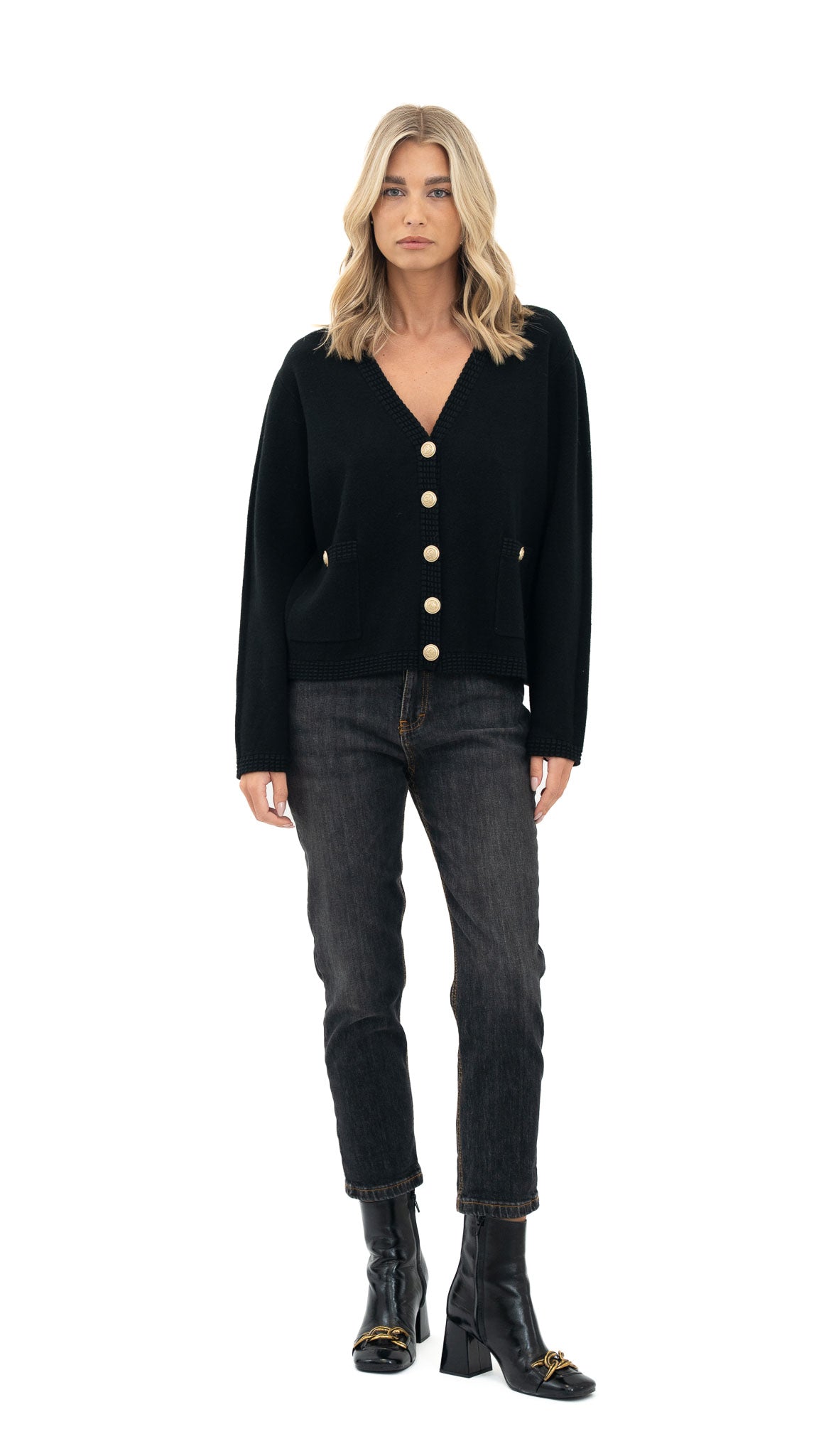 Opis proizvoda: Kardigan od mekane viskoze s V-izrezom i gumbima sprijeda. Jednostavan i svestran komad koji se lako uklapa u svakodnevne i poslovne kombinacije.