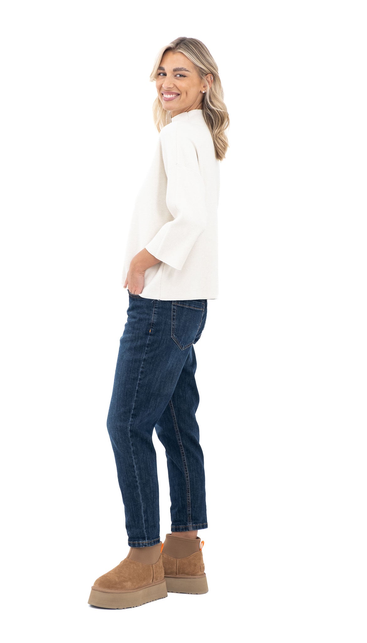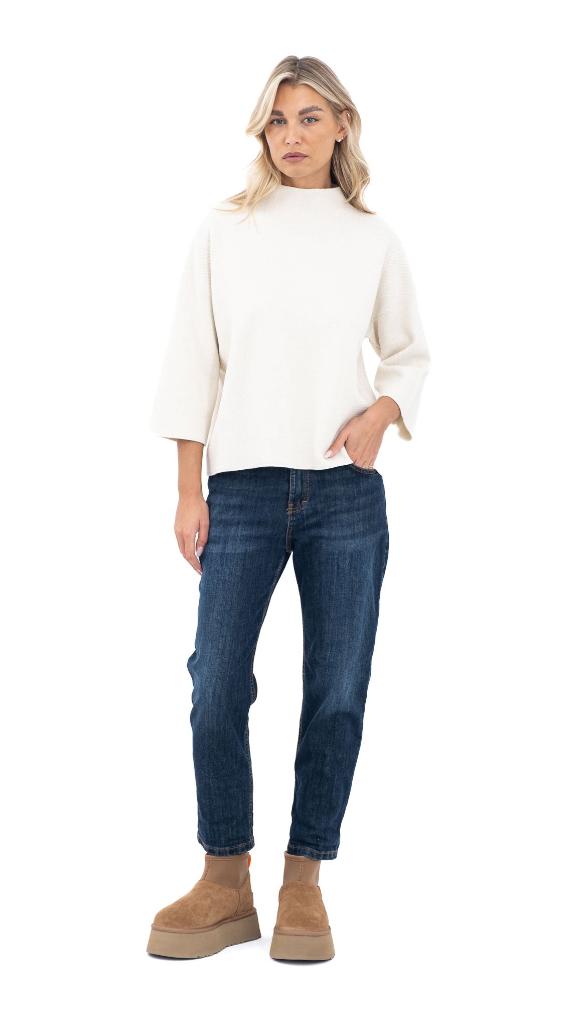 Jednostavna majica boja vanilije od viskoze s povišenim ovratnikom i lagano širokim rukavima. Savršena za udobne i elegantne svakodnevne kombinacije.
