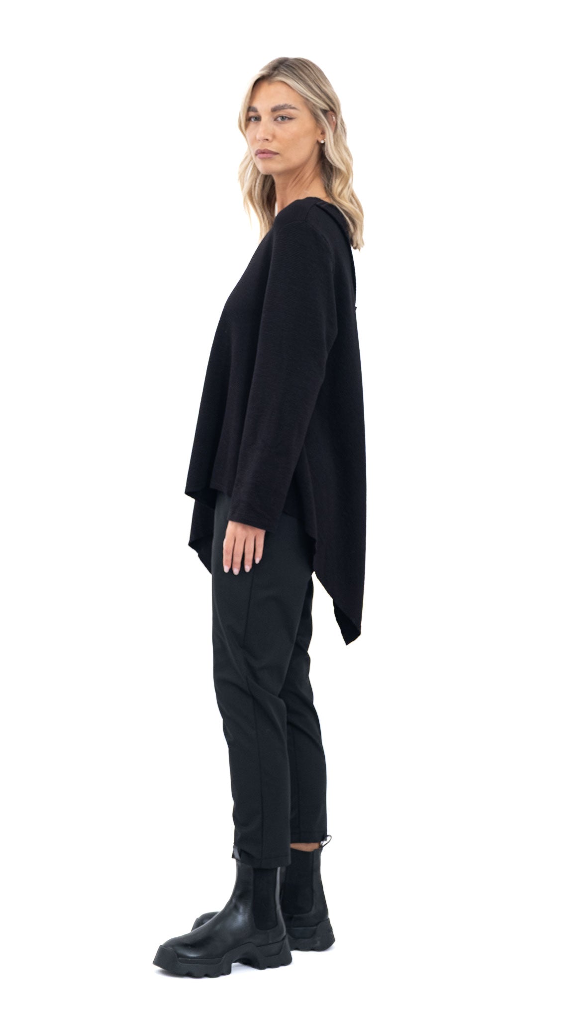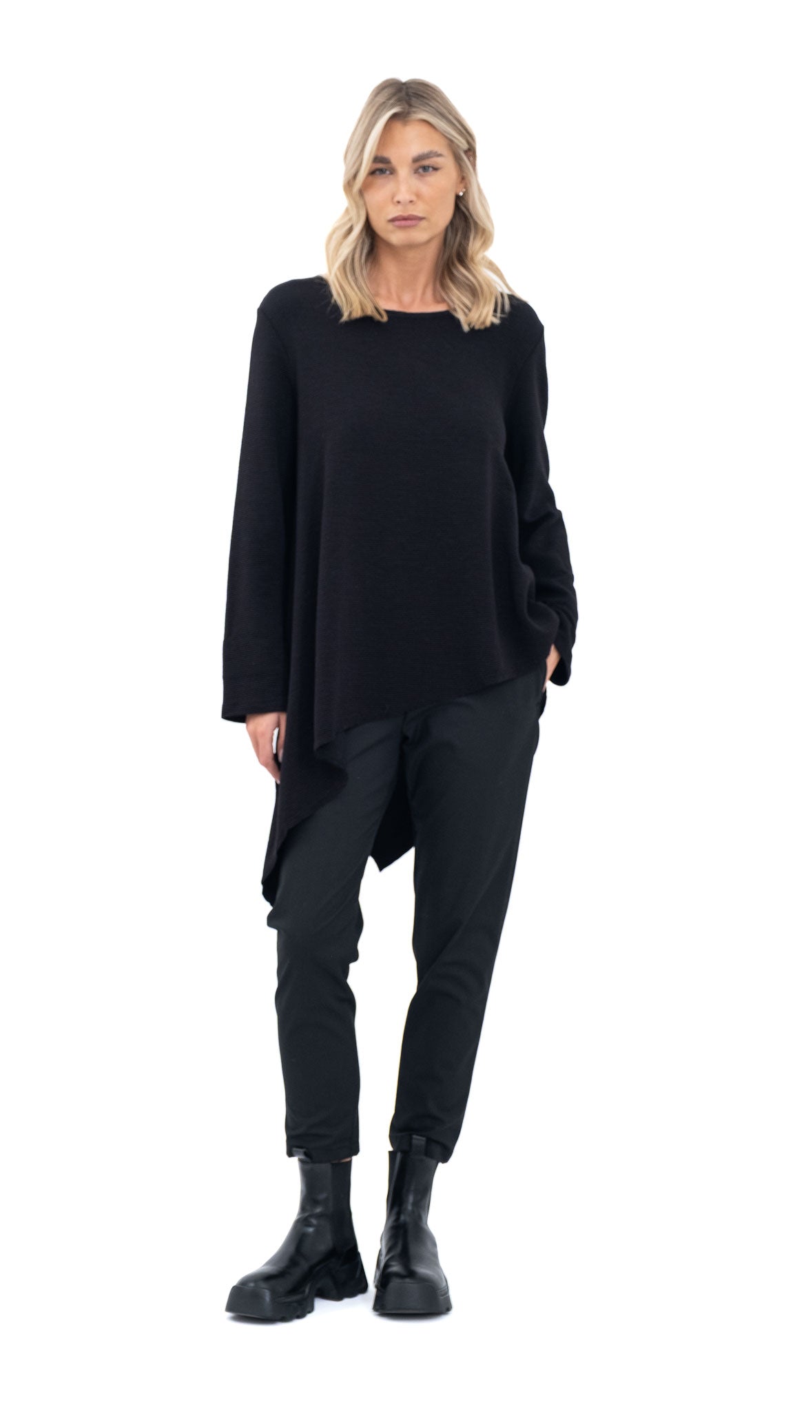 Crna majica od viskoze s asimetričnim rubom. Udobna i lagana, pogodna za svakodnevno nošenje.