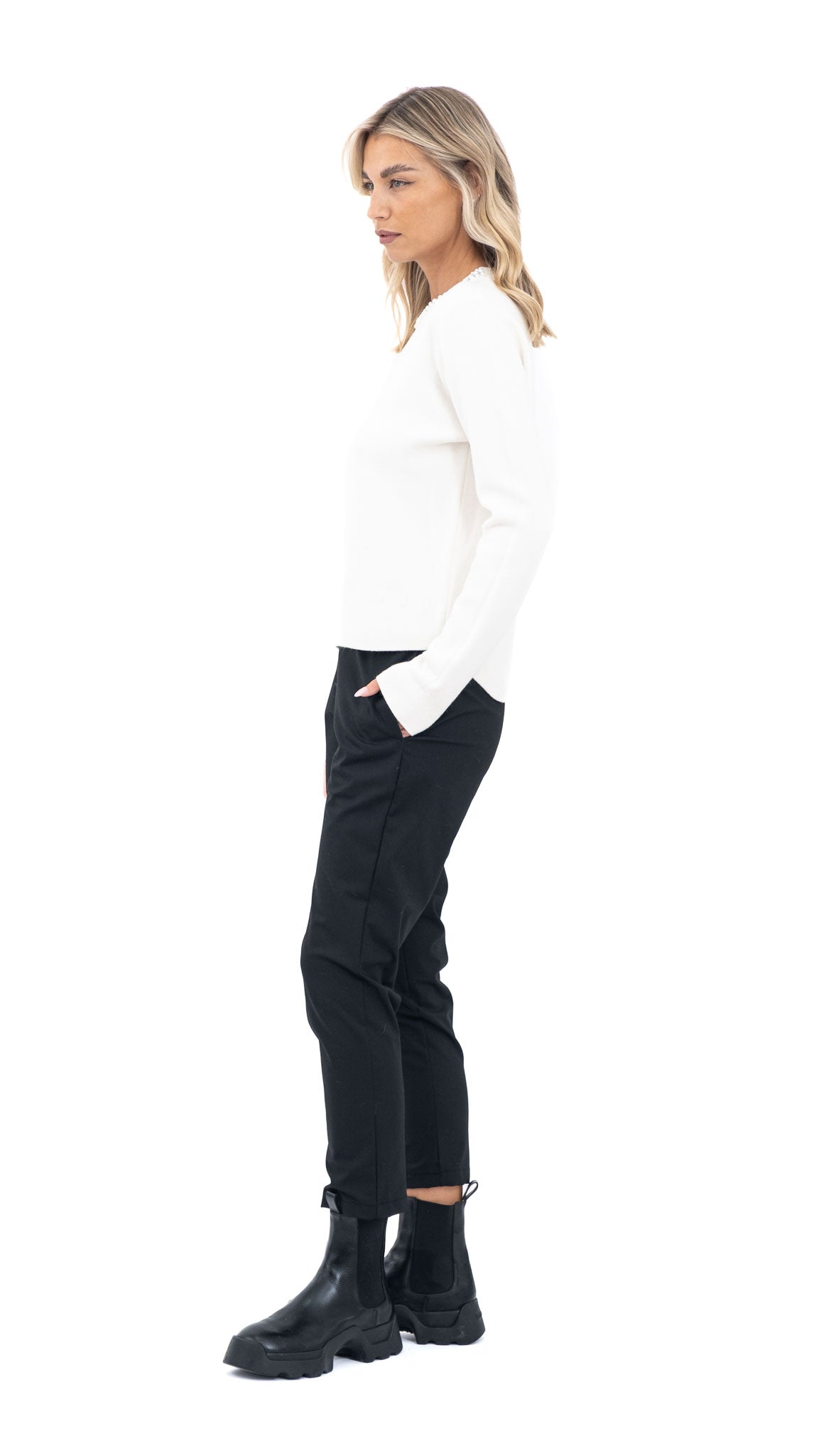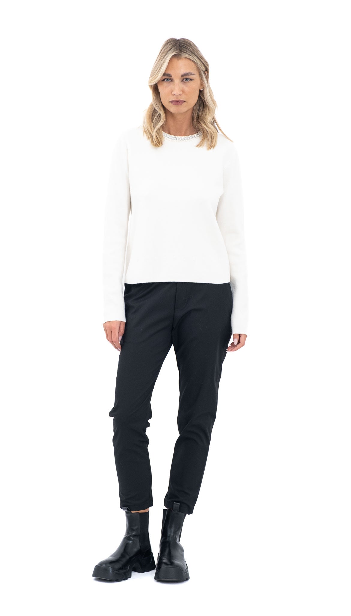 Bijela majica od viskoze s jednostavnim krojem. Lagana, ugodna i nosiva kroz sve sezone. Obrub oko vrata obrubljen perlicama.
