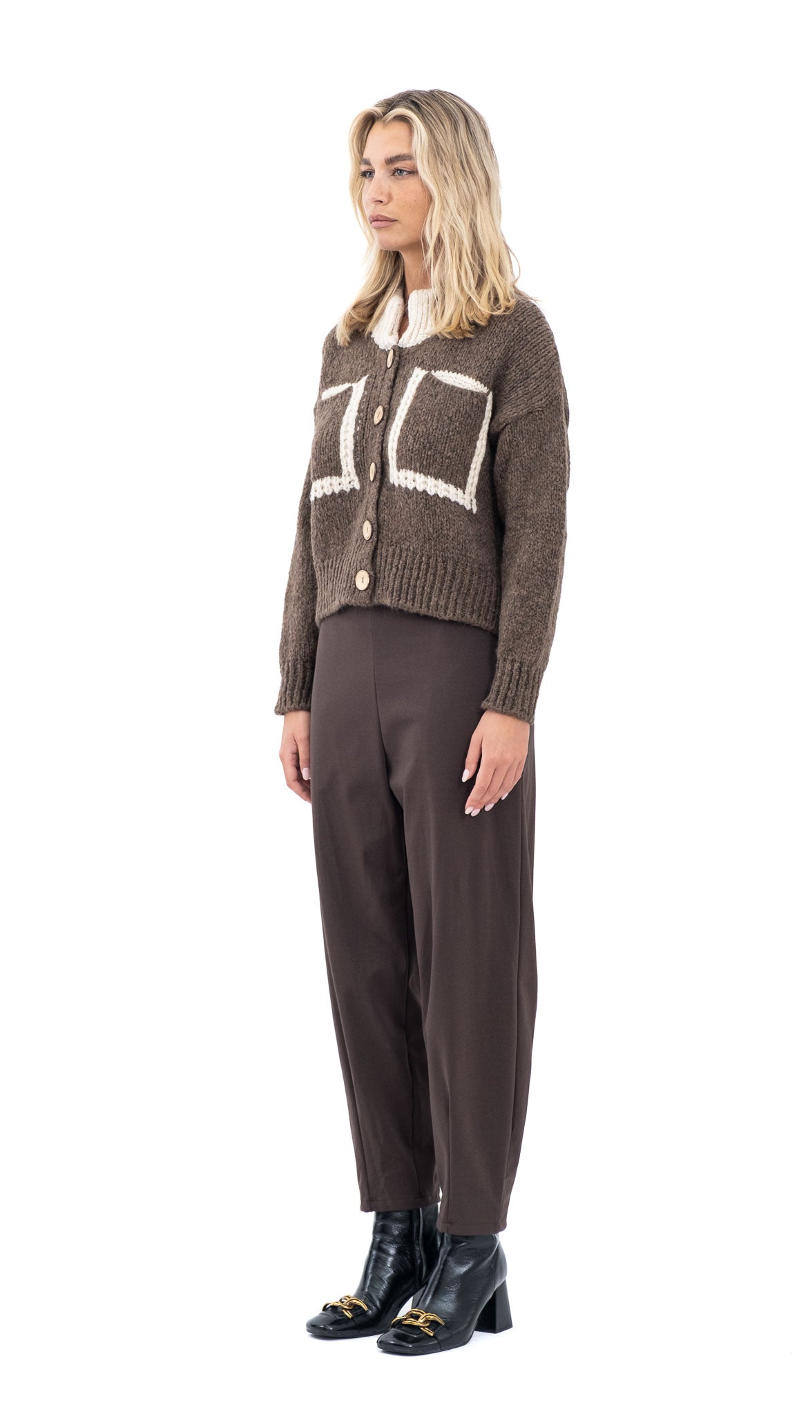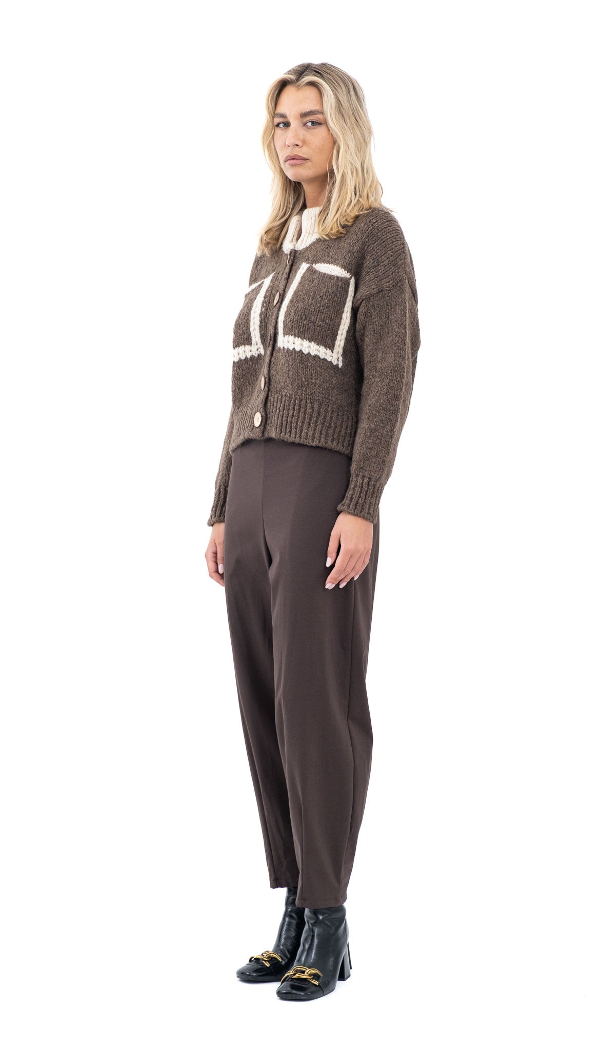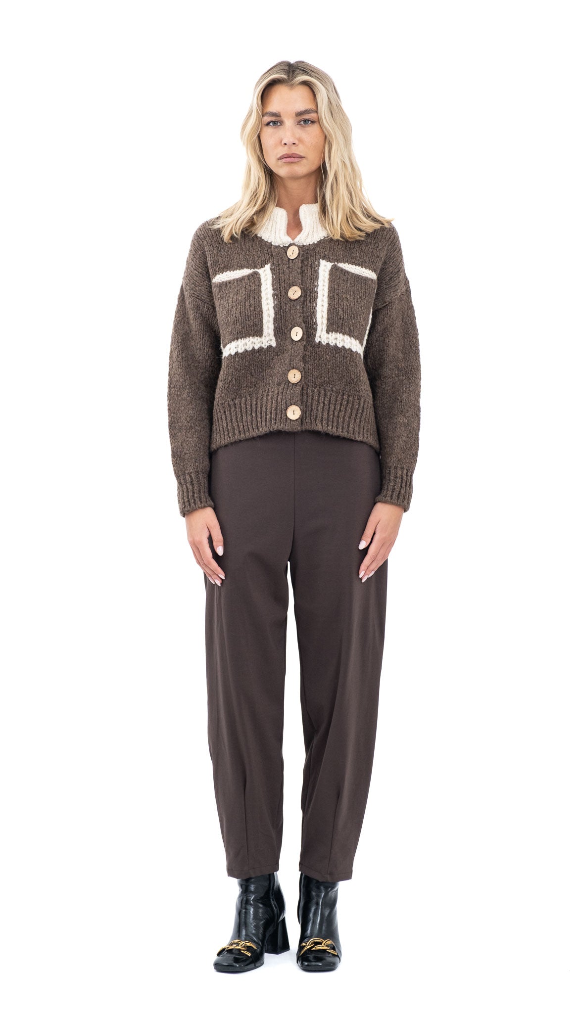 Smeđa vesta od viskoze s kontrastnim detaljima i gumbima sprijeda. Udobna i mekana, s opuštenim krojem koji omogućuje lako kombiniranje u svakodnevnim outfitima.