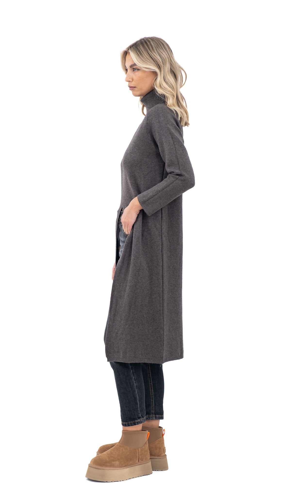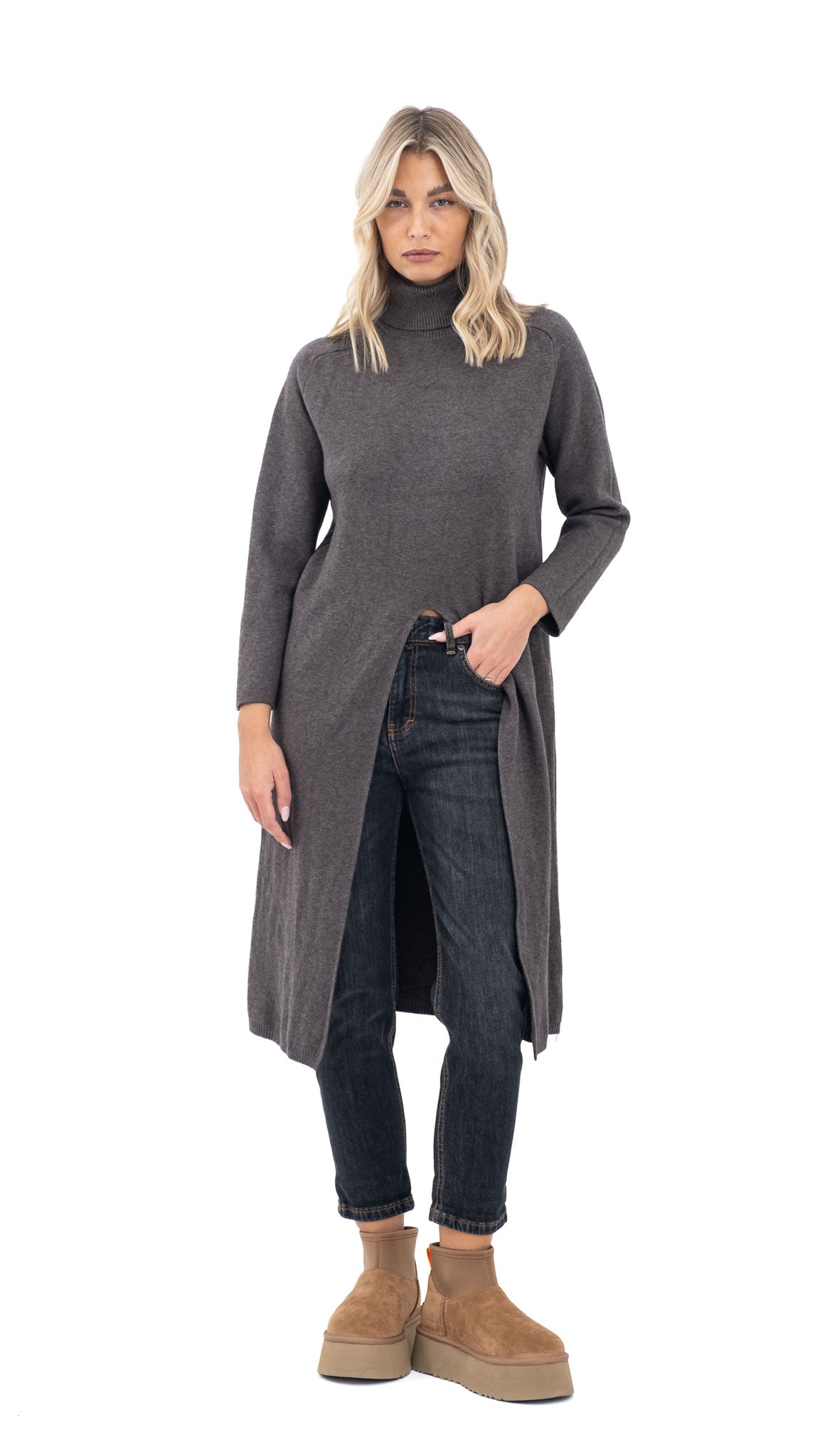 Siva tunika od viskoze s visokim ovratnikom i elegantnim prorezom sprijeda. Kombinira udobnost i moderan dizajn, idealna za slojevito odijevanje.
