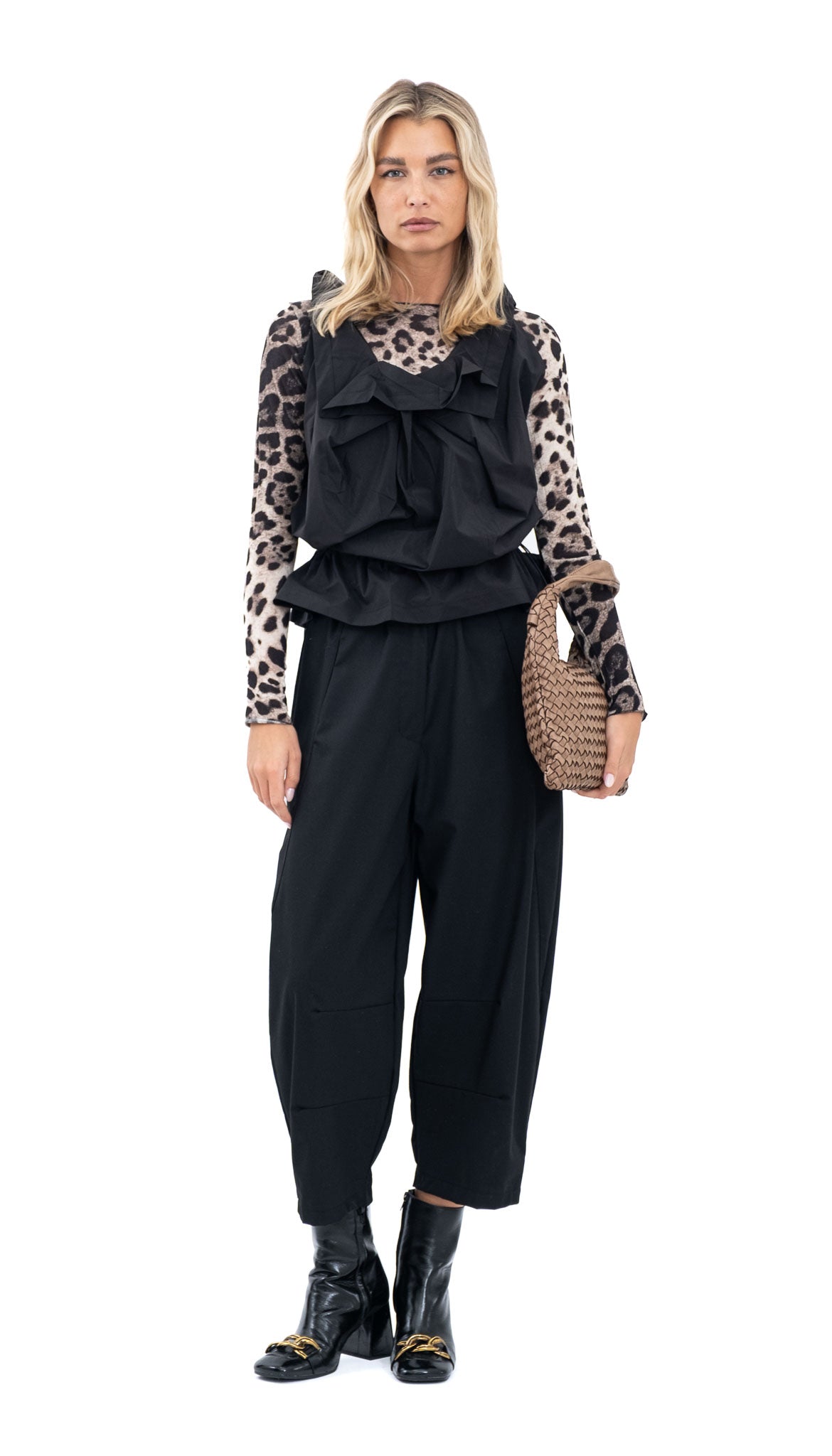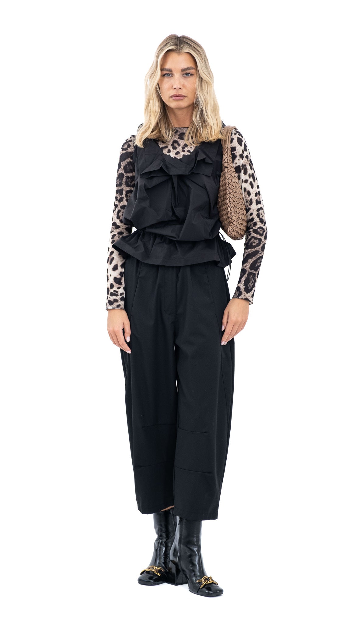 Crni prsluk od viskoze s izraženim volanima sprijeda. Lagana i ugodna tkanina pruža udobnost tijekom nošenja, a ležeran kroj omogućuje lako kombiniranje preko majica ili košulja.