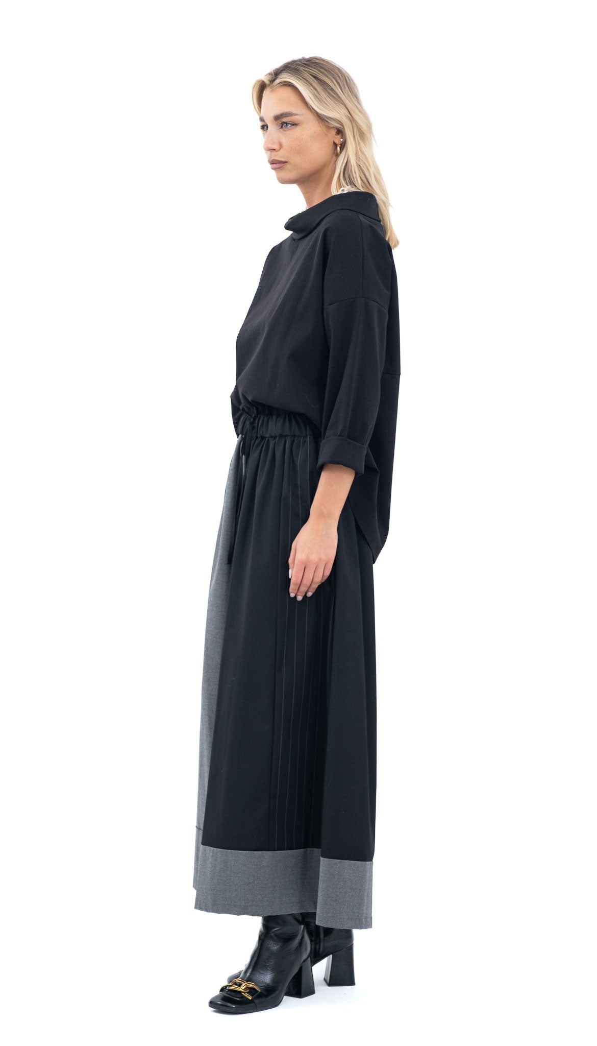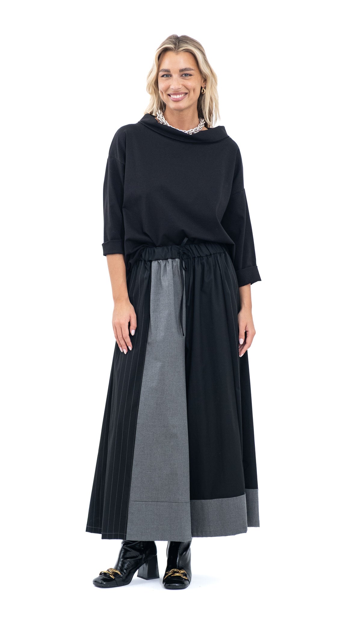 Crna majica od viskoze s povišenim ovratnikom i tričetvrt rukavima. Mekana i udobna tkanina čini je praktičnim izborom za svakodnevno nošenje.