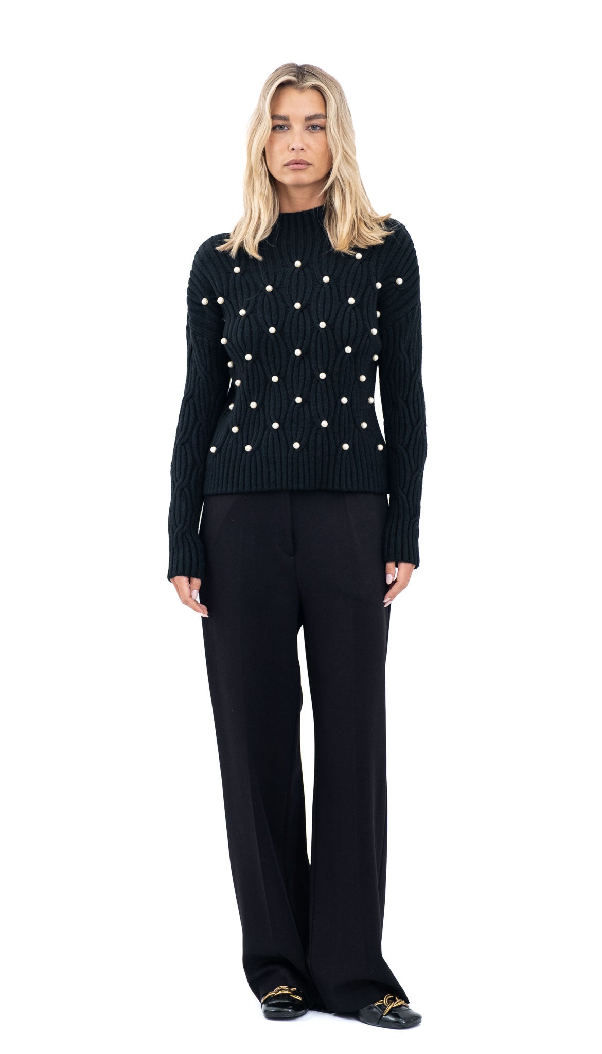 Crna majica od viskoze s ukrasnim biserima sprijeda. Mekana, udobna i ženstvena, pruža profinjen izgled uz dašak razigranosti.