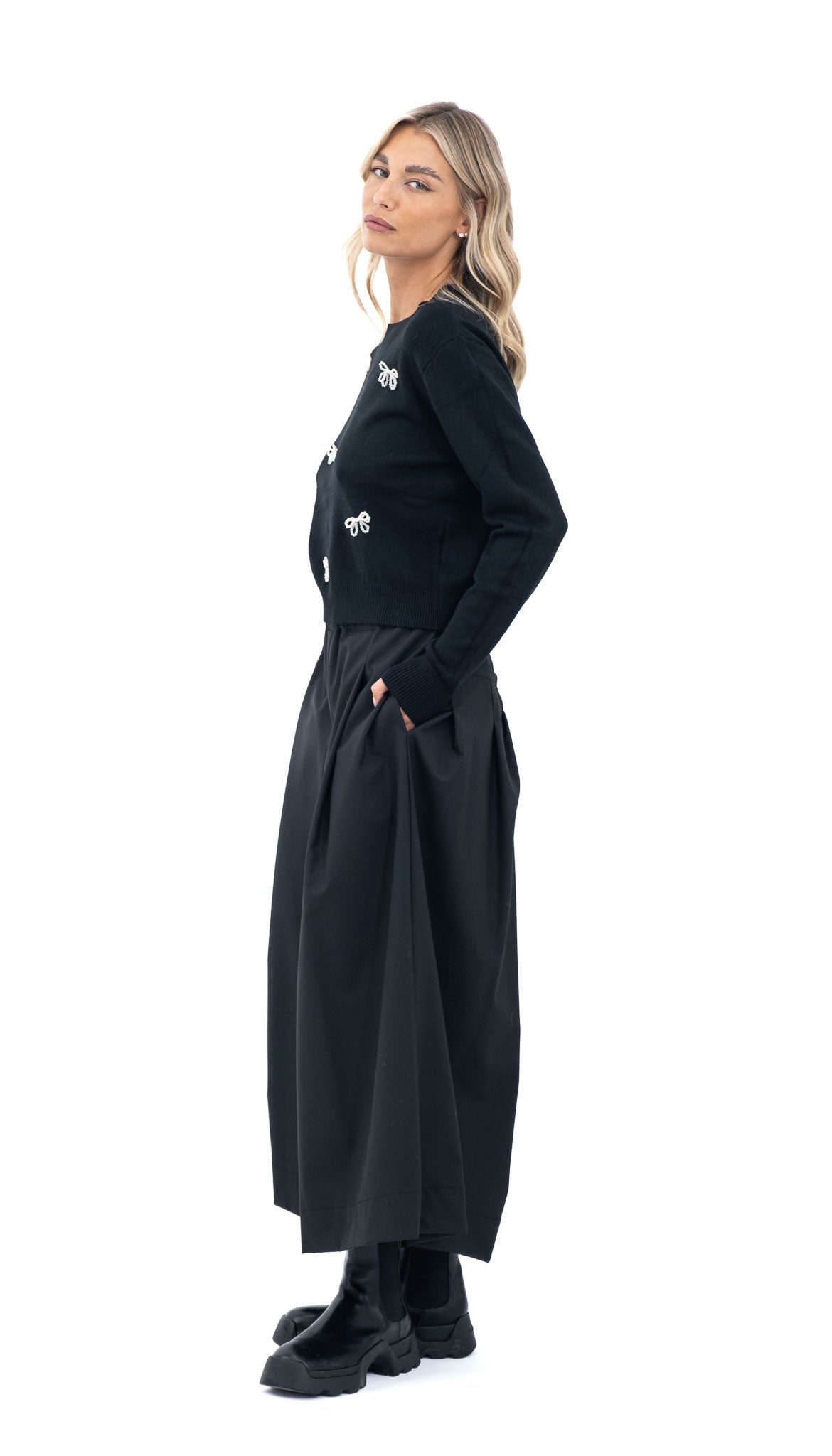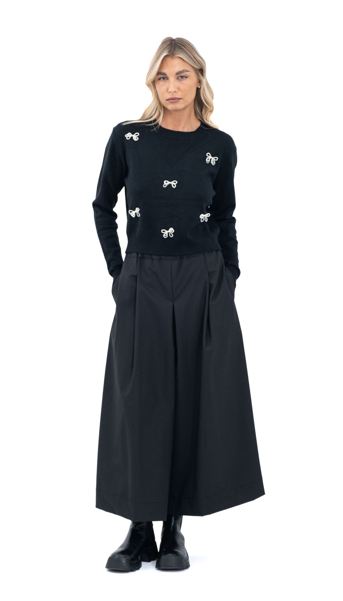 Elegantna crna majica od viskoze ukrašena bisernim mašnama. Suptilan, ali upečatljiv komad koji svakoj kombinaciji daje ženstven i profinjen dodir.