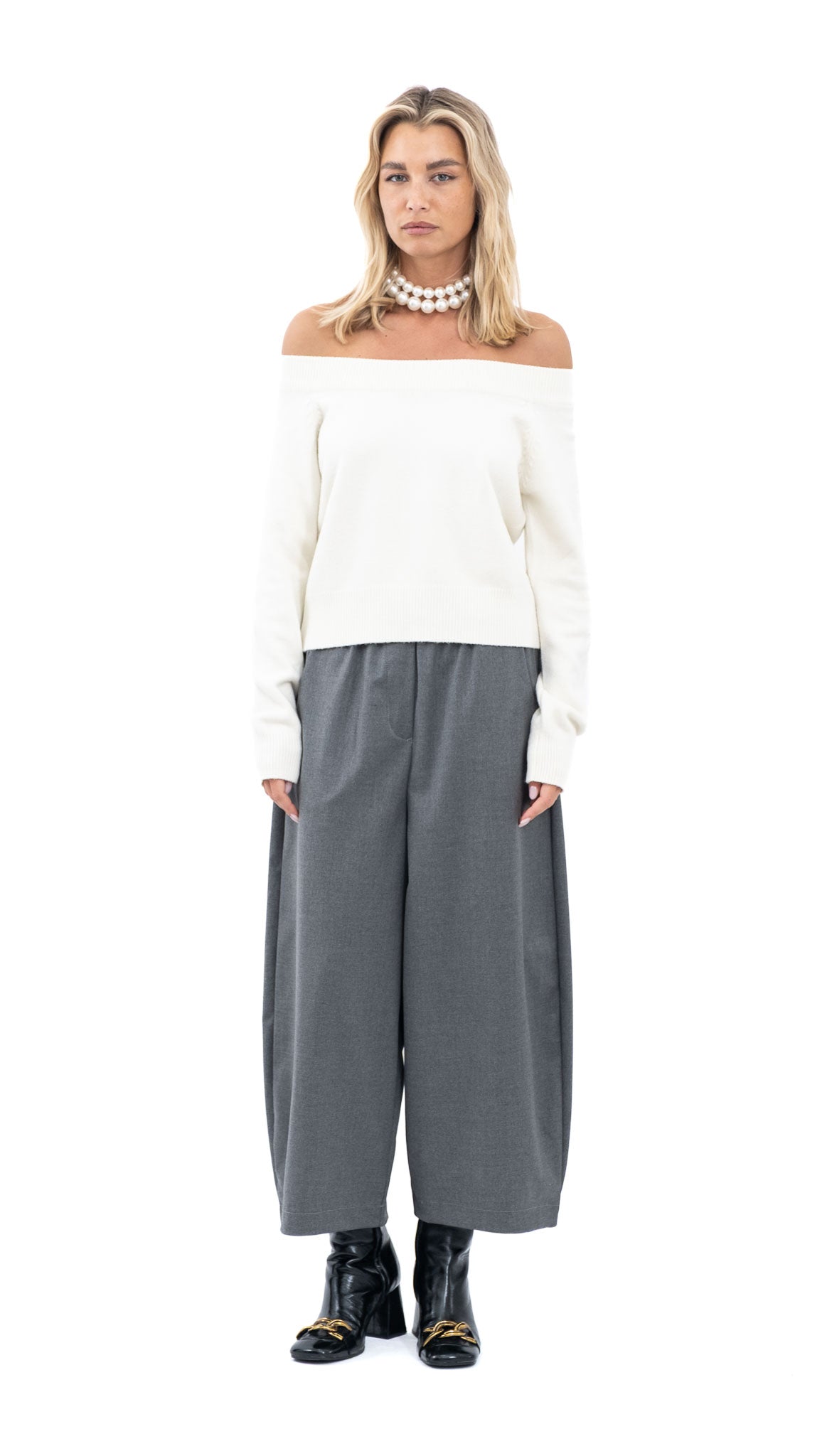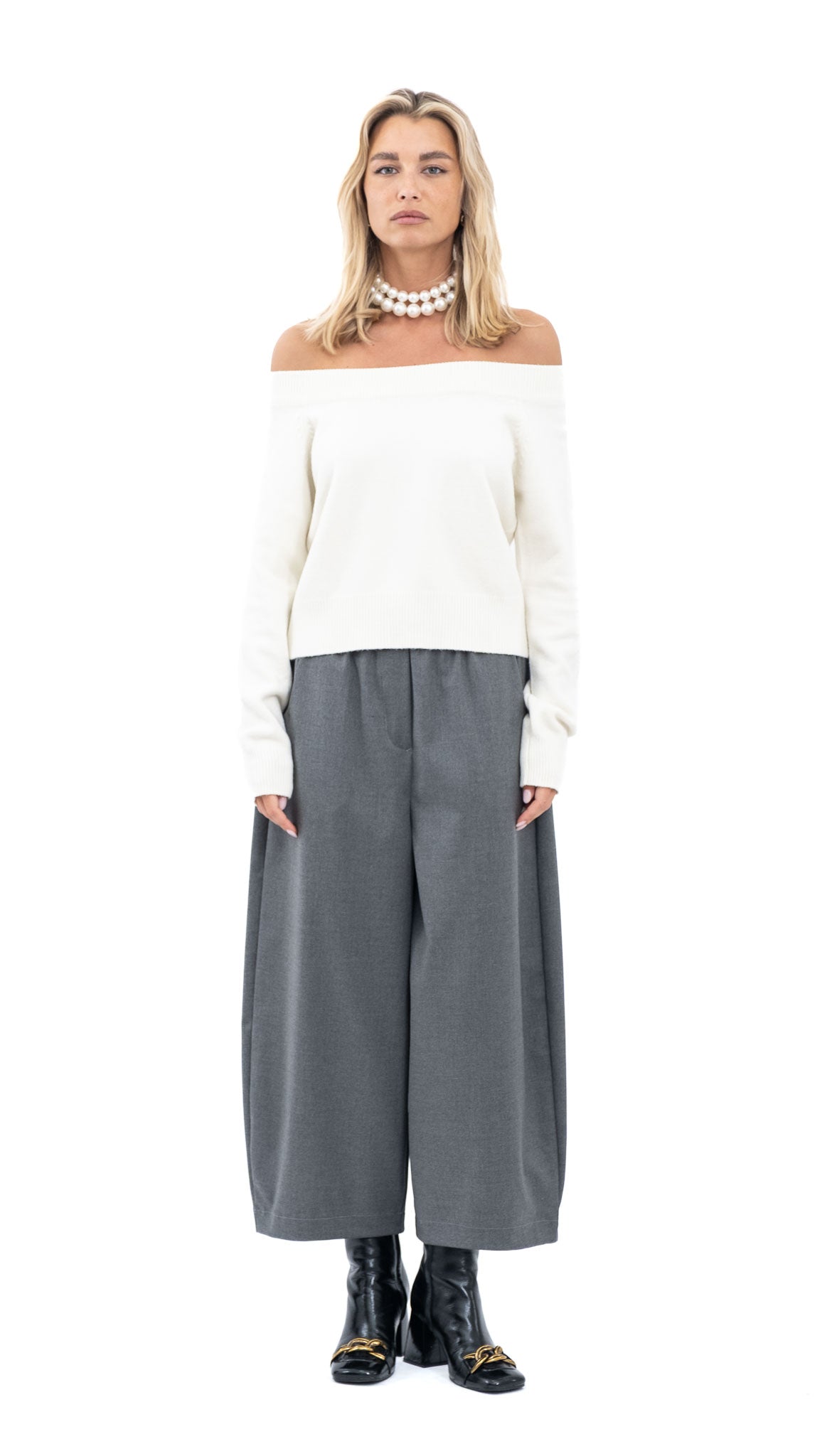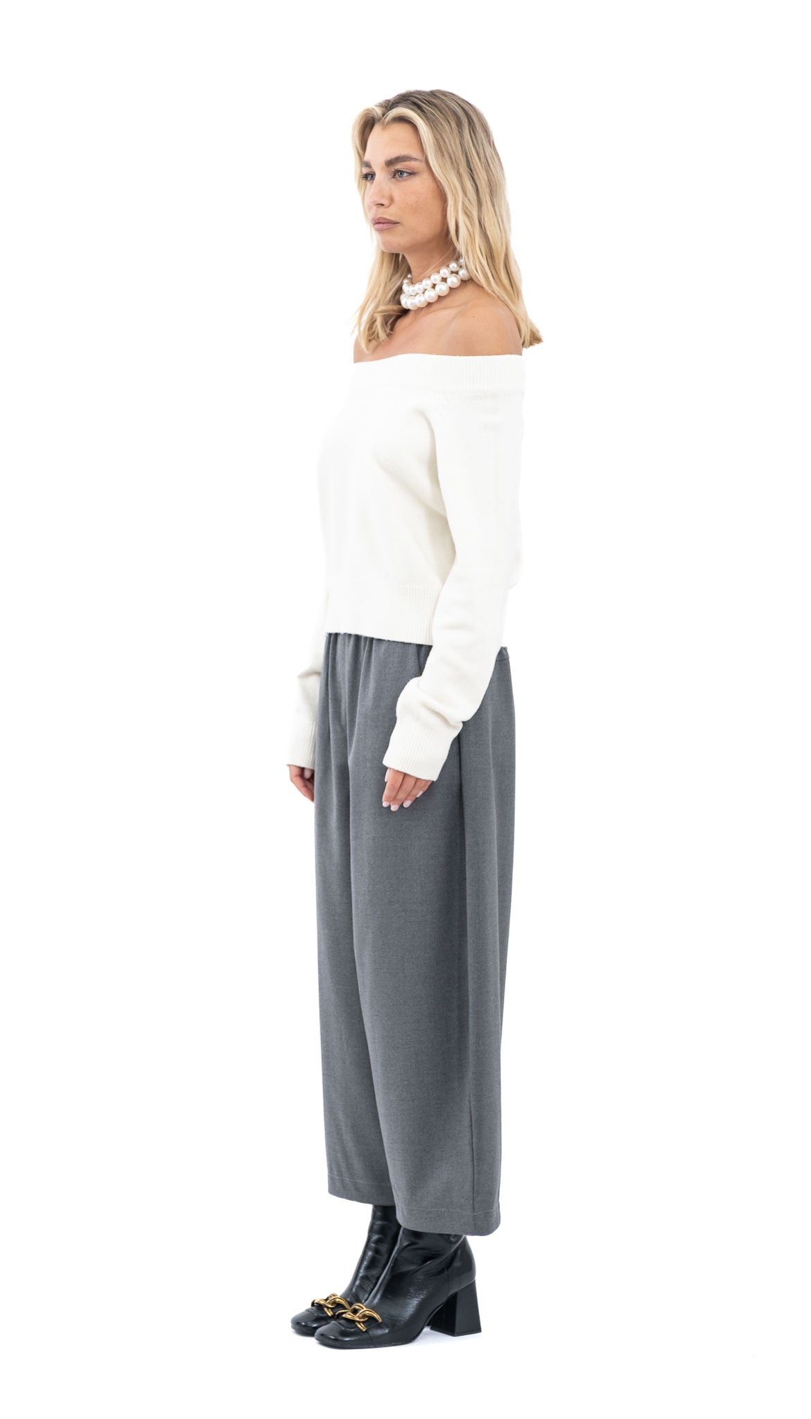 Bijela majica od viskoze s otvorenim ramenima. Lagana, udobna i ženstvena, savršena za stvaranje profinjenog, ali opuštenog izgleda.