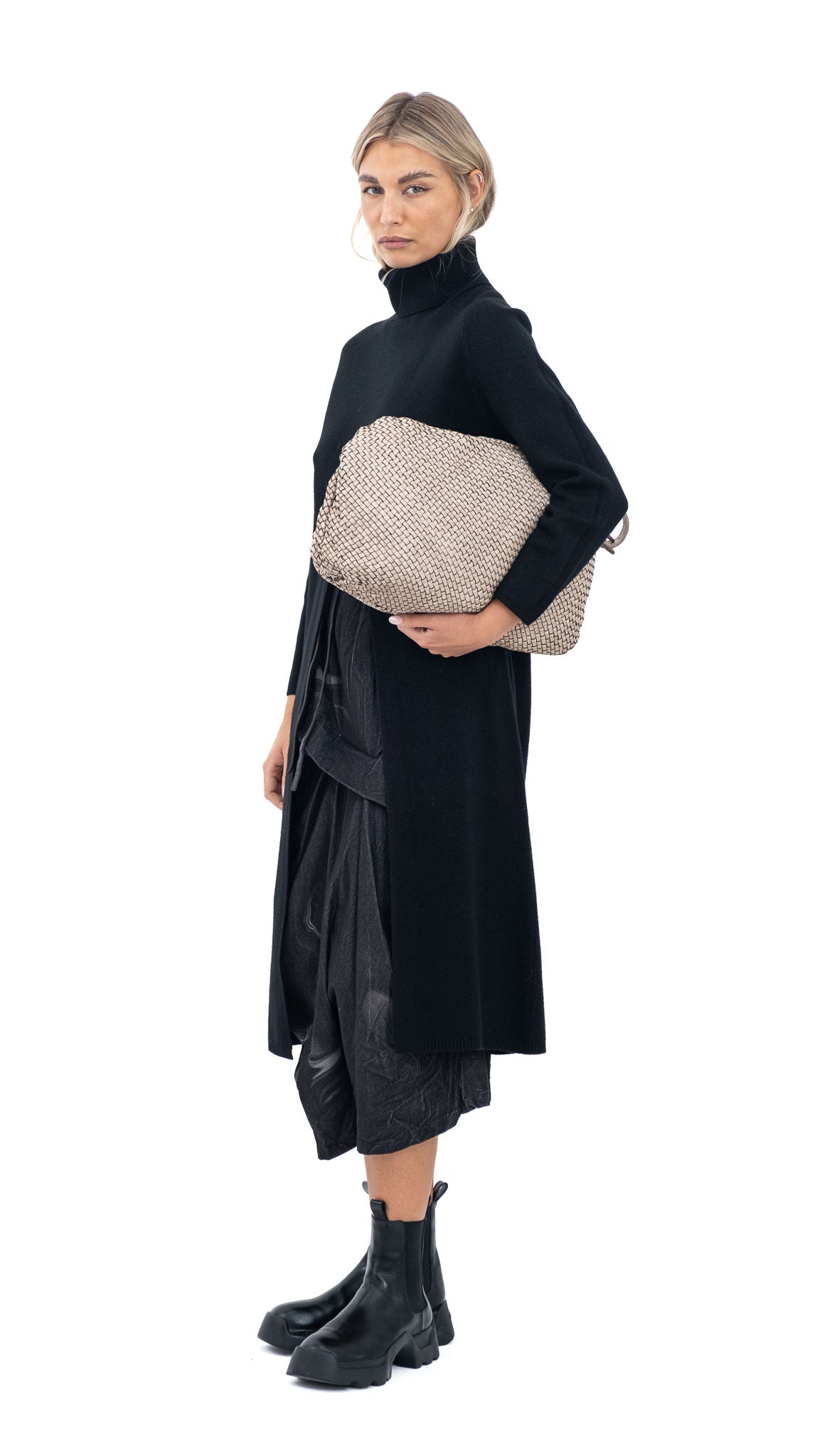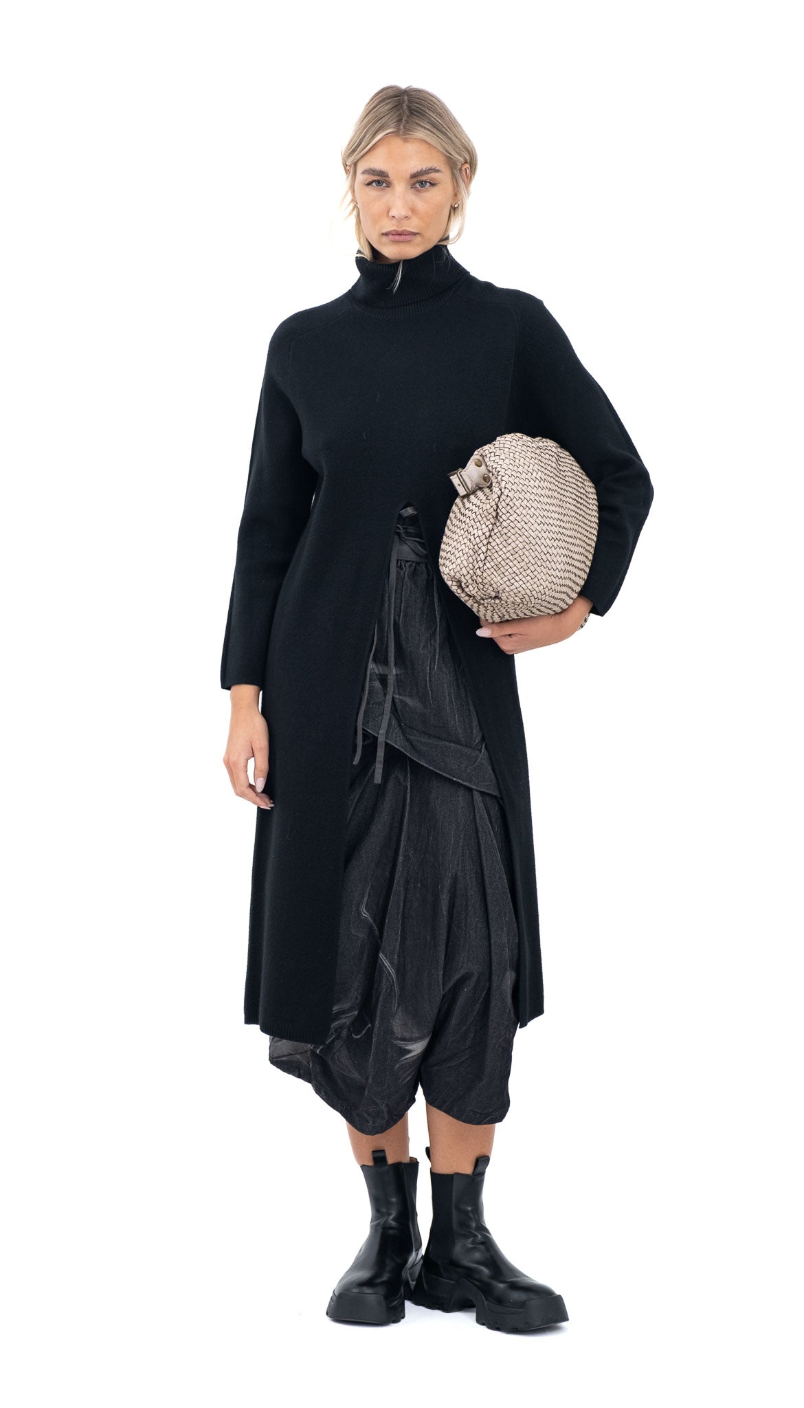 Crna tunika od viskoze s visokim ovratnikom i dužim krojem. Minimalistička i elegantna, idealna za slojevite kombinacije i svakodnevno nošenje. Otvorena sprijeda.