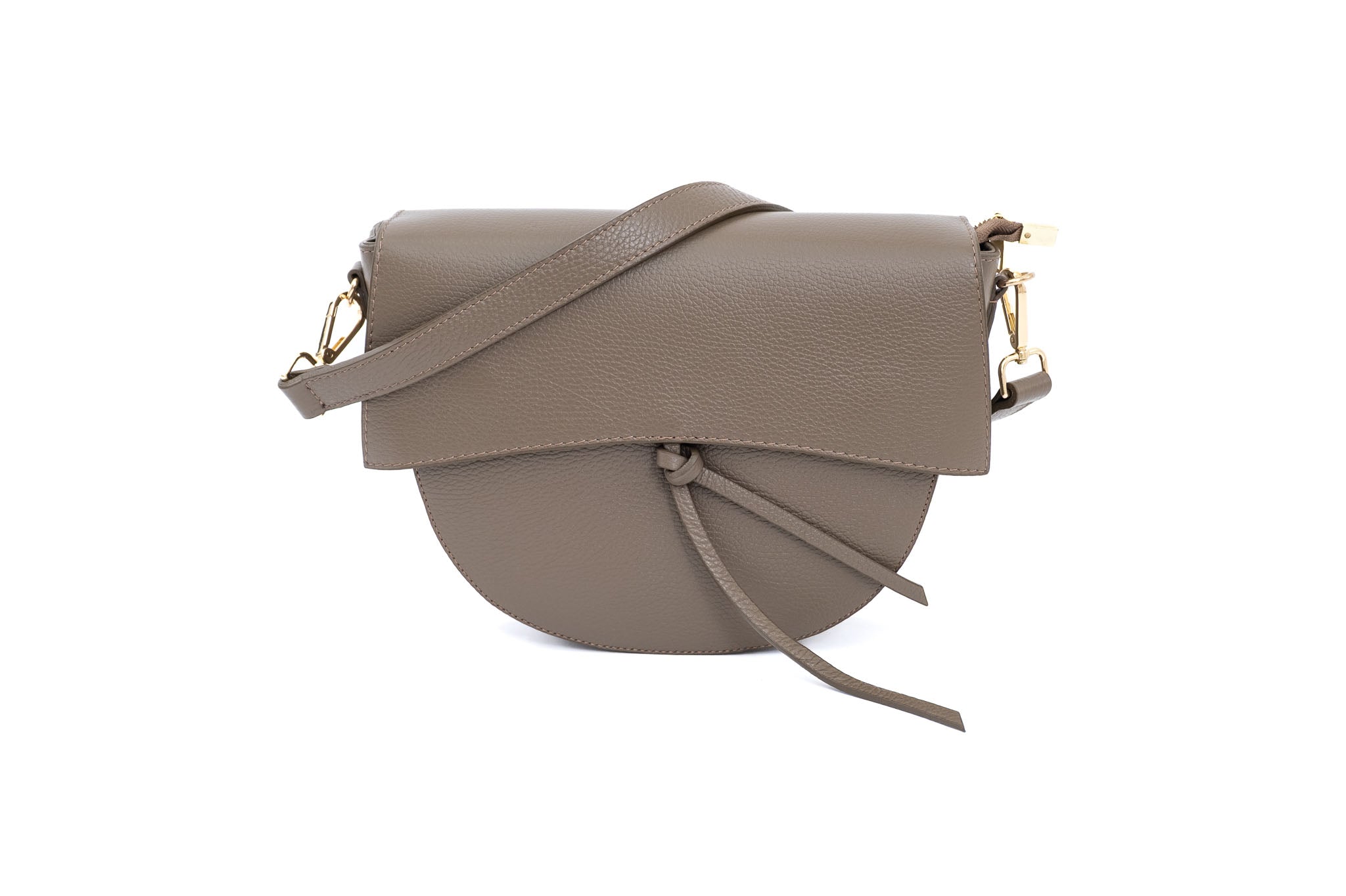 Torba izrađena od kvalitetne prirodne kože u modernoj sivoj taupe nijansi. Jednostavna, ali profinjena silueta upotpunjena je dekorativnim remenom i detaljima u zlatnom tonu koji daju suvremen i luksuzan dojam.