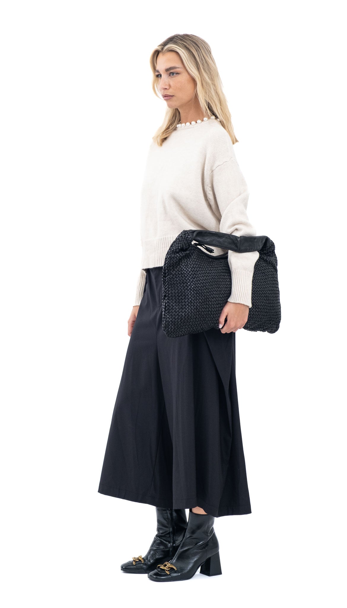 Ručno izrađena torba od prirodne kože u klasičnoj crnoj boji koja se lako uklapa u svaki stil. Pletena struktura i mekana tekstura daju joj prepoznatljiv izgled i udobnost pri nošenju.